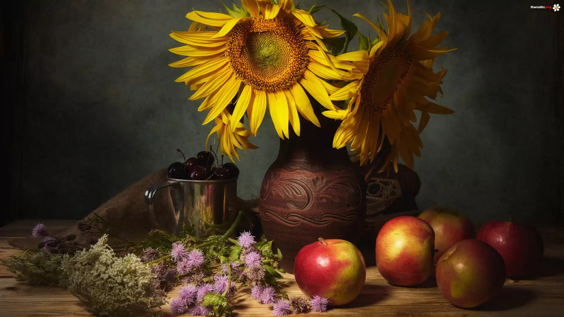 Kompozycja, Wazon, Kwiaty, Słoneczniki, Jabłka, Garnuszek, Czereśnie - Zdjęcia