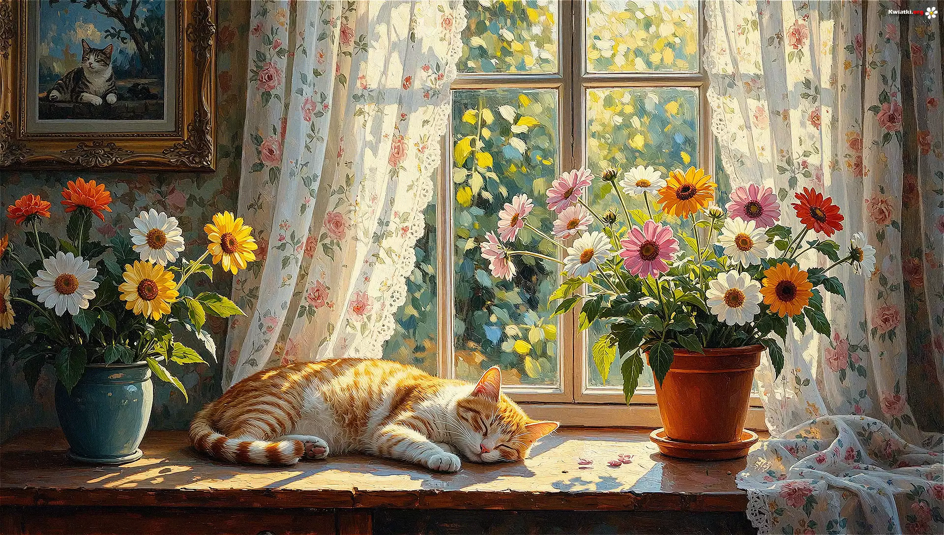 Kwiat Rudy, Śpiący, Kot, Parapet, Okno, Kwiaty, Doniczka, Wazon