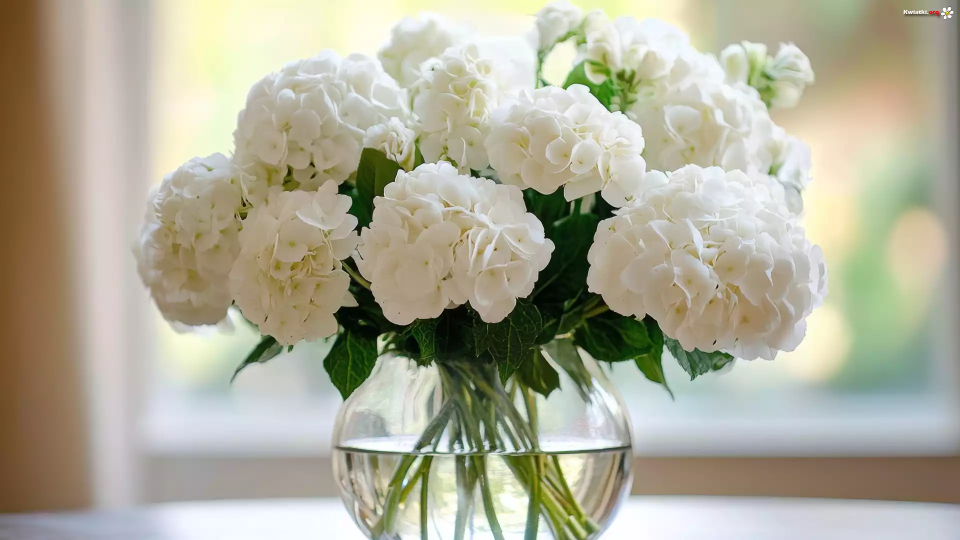 Kwiaty, Białe, Hortensje, Wazon - Zdjęcia