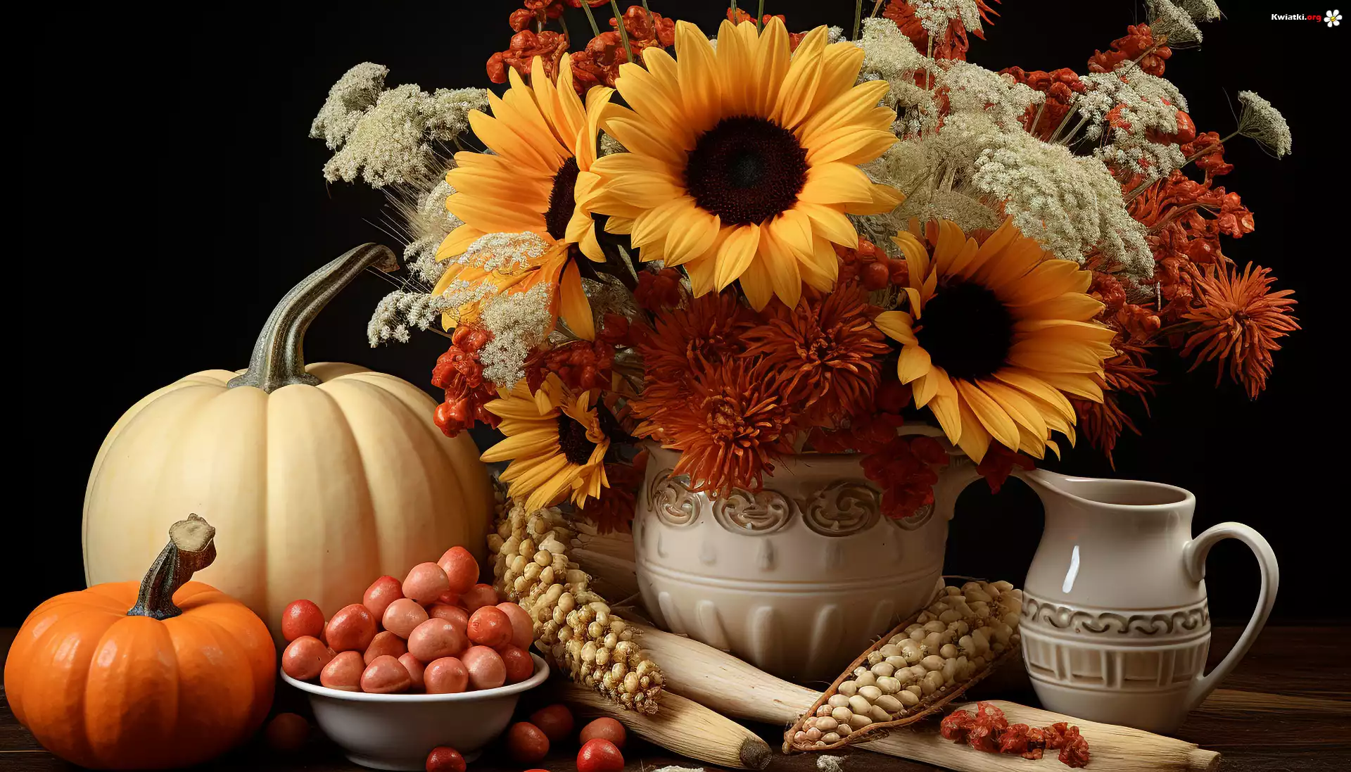 Bukiet, Kolorowe, Kwiaty, Wazon, Dynie, Winogrona, Kompozycja - Zdjęcia