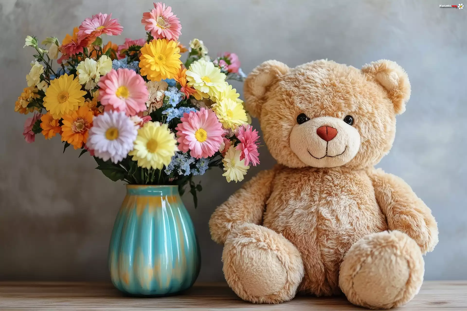 Kolorowe, Kwiaty, Bukiet, Wazon, Pluszowy, Miś - Zdjęcia