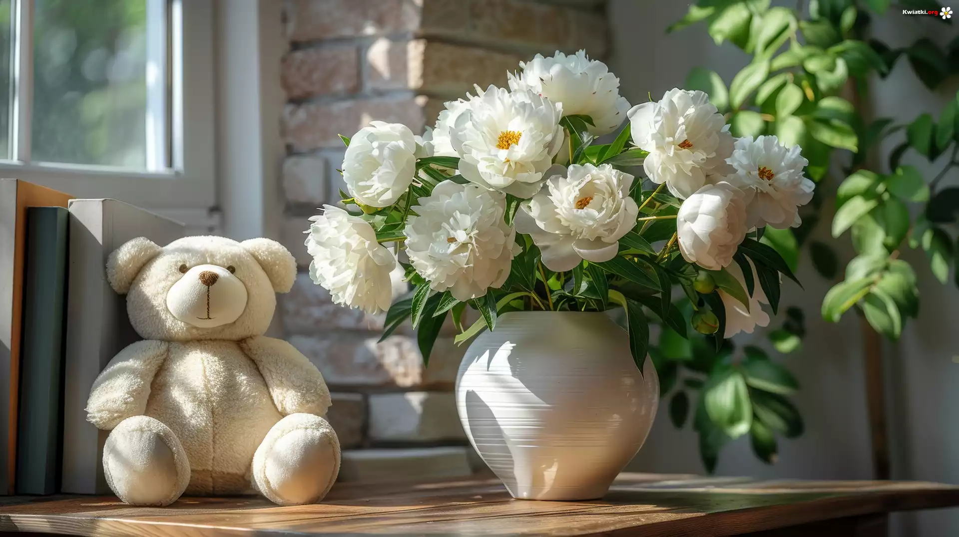 Bukiet, Białe, Piwonie, Wazon, Zabawka, Miś - Zdjęcia