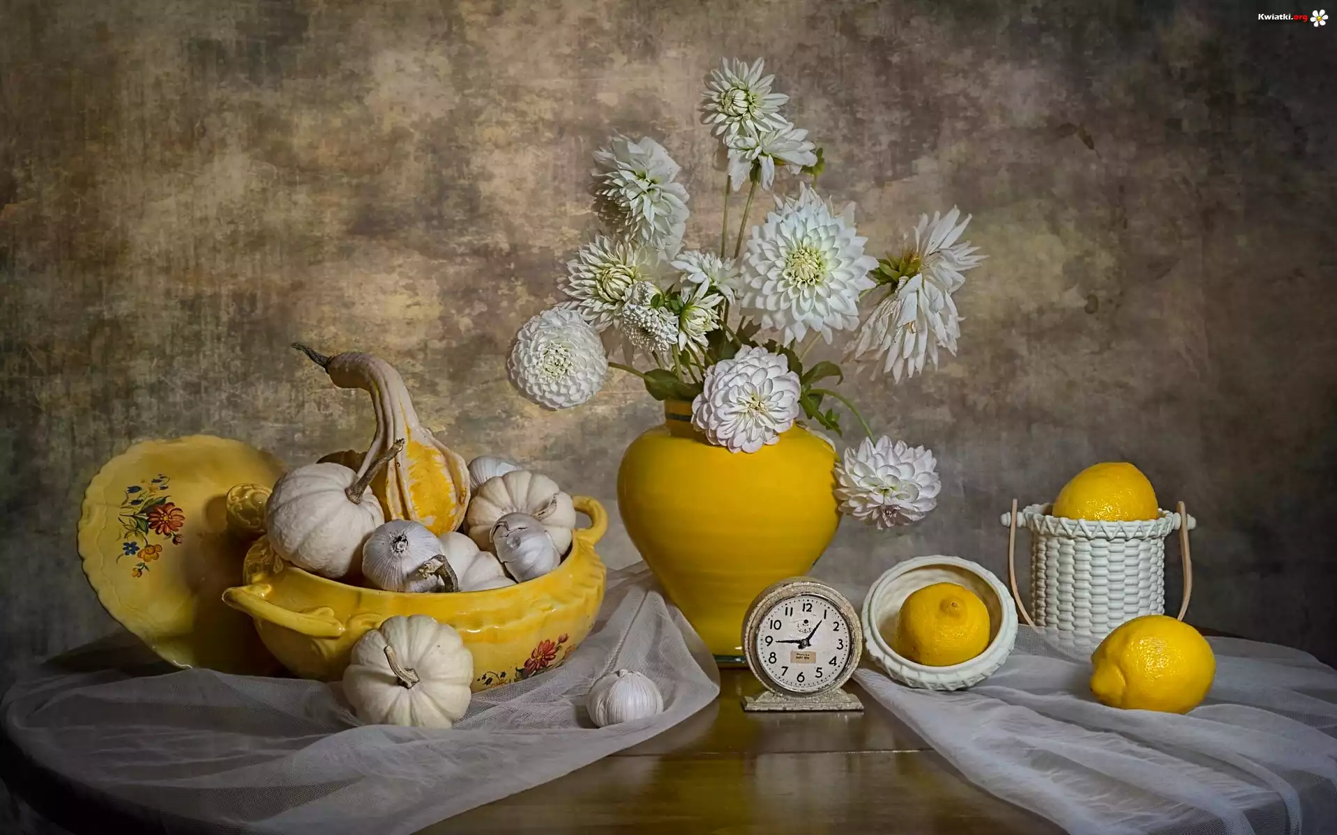 Dalie, Żółty, Wazon, Dynie ozdobne, Czosnek, Waza, Budzik, Cytryny, Koszyczek, Stół - Zdjęcia