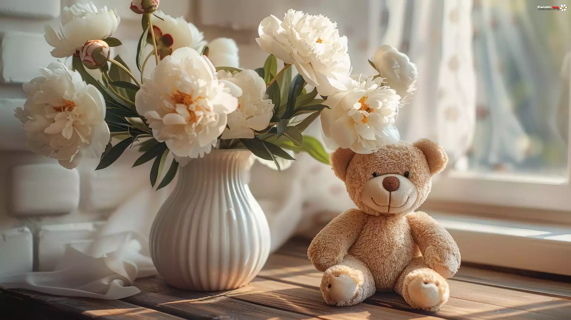 Kwiat Bukiet, Białe, Piwonie, Wazon, Zabawka, Miś, Okno