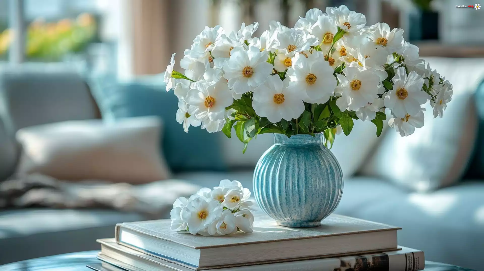 Kwiaty, Białe, Zawilce, Wazon, Książki, Salon - Zdjęcia