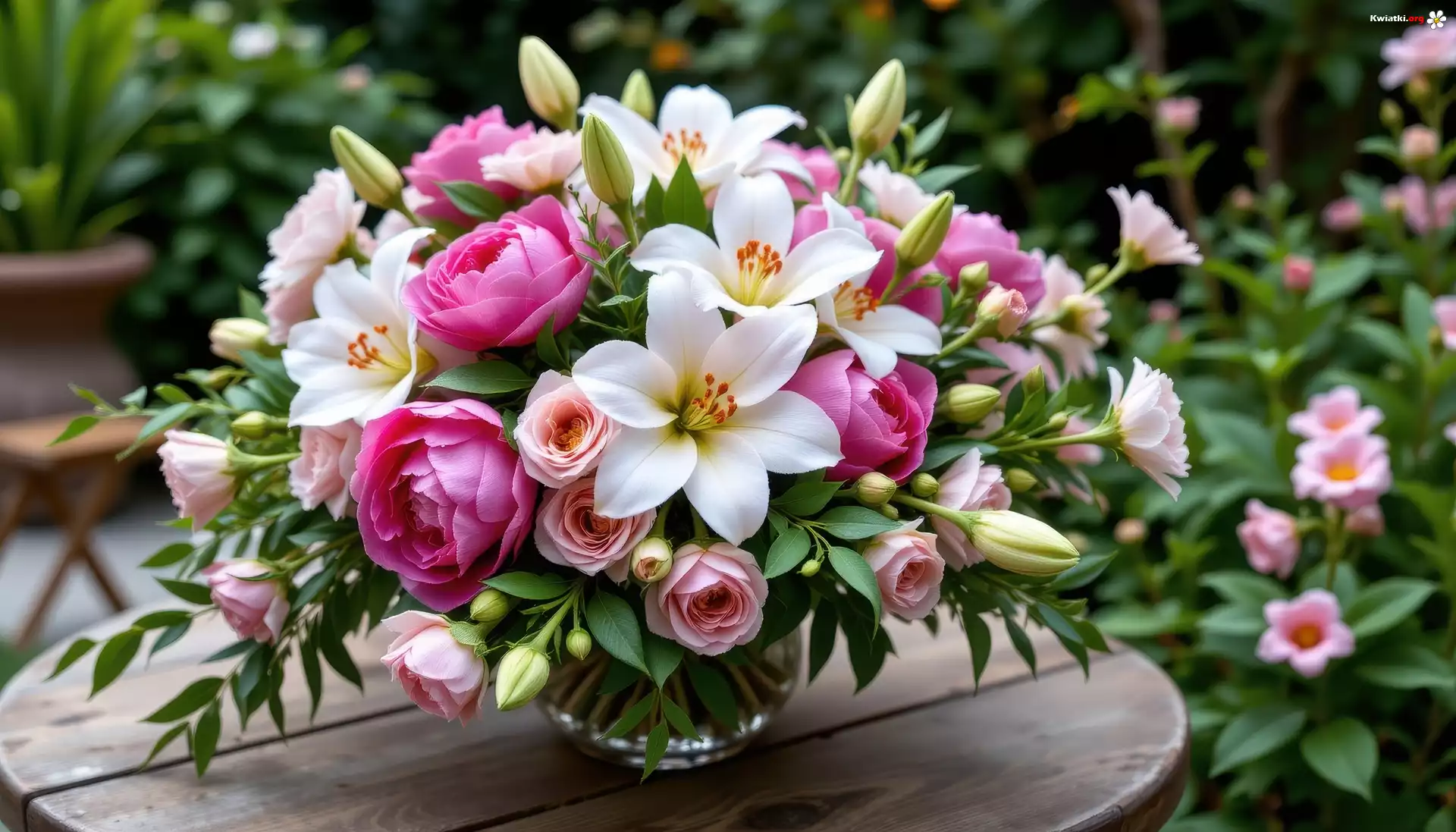 Kwiaty, Kolorowe, Lilie, Piwonie, Kamelie, Bukiet, Wazon, Stół, Ogród, Grafika AI - Zdjęcia