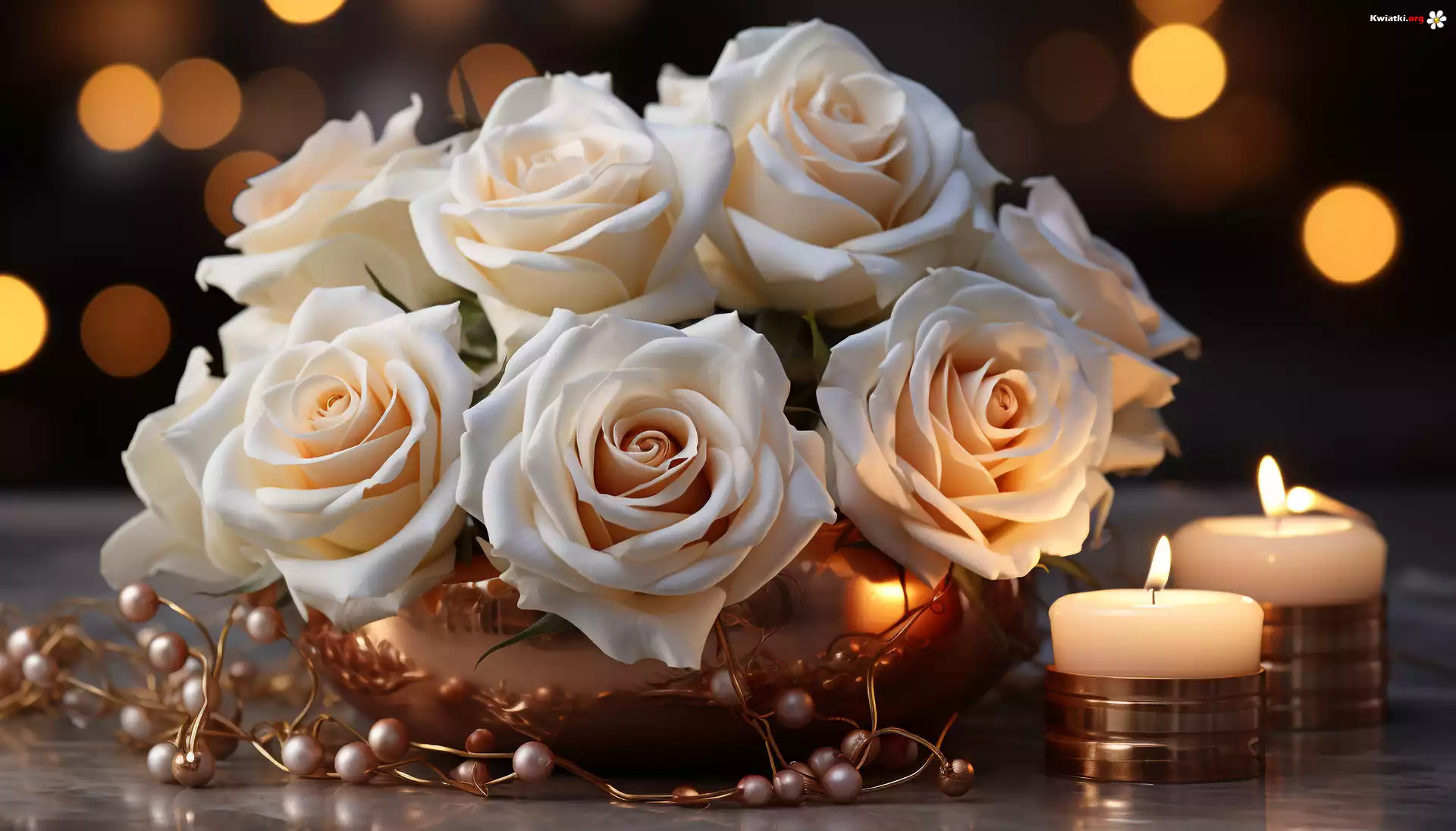 Kompozycja, Białe, Róże, Wazon, Koraliki, Świeczki - Zdjęcia