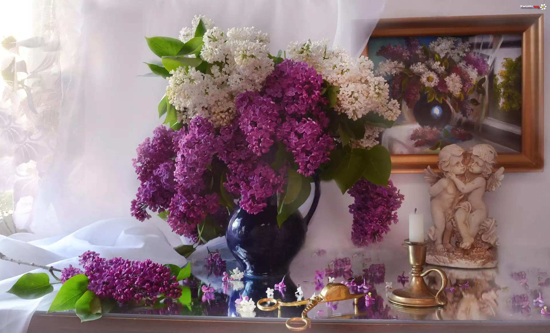Kwiat Obraz, Wazon, Bukiet, Bez, Figurka, Aniołki, Świecznik, Świeczka