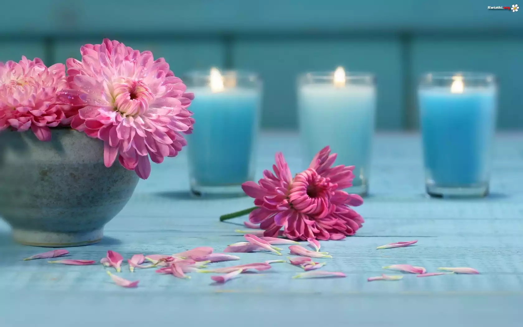 Kwiat Wazonik, Kwiaty, Płatki, Niebieskie, Świeczki, Dekoracja