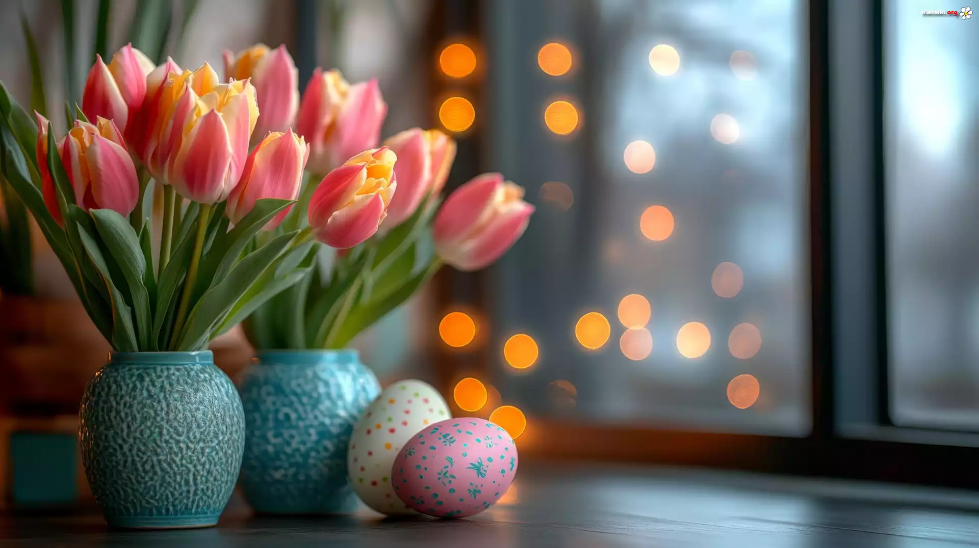 Kwiaty, Tulipany, Niebieskie, Wazony, Kolorowe, Pisanki, Okno - Zdjęcia