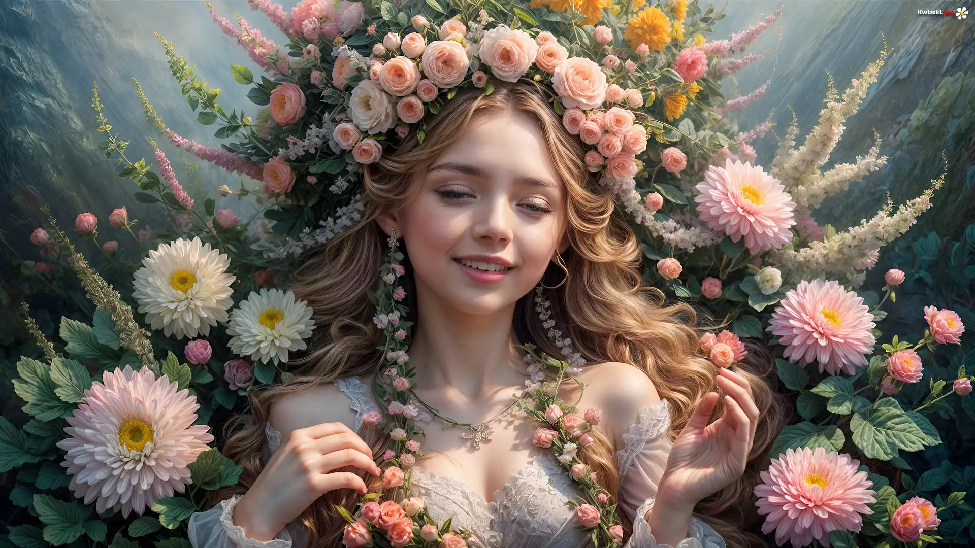Młoda, Kobieta, Blondynka, Wianek, Kwiaty, Dalie - Zdjęcia