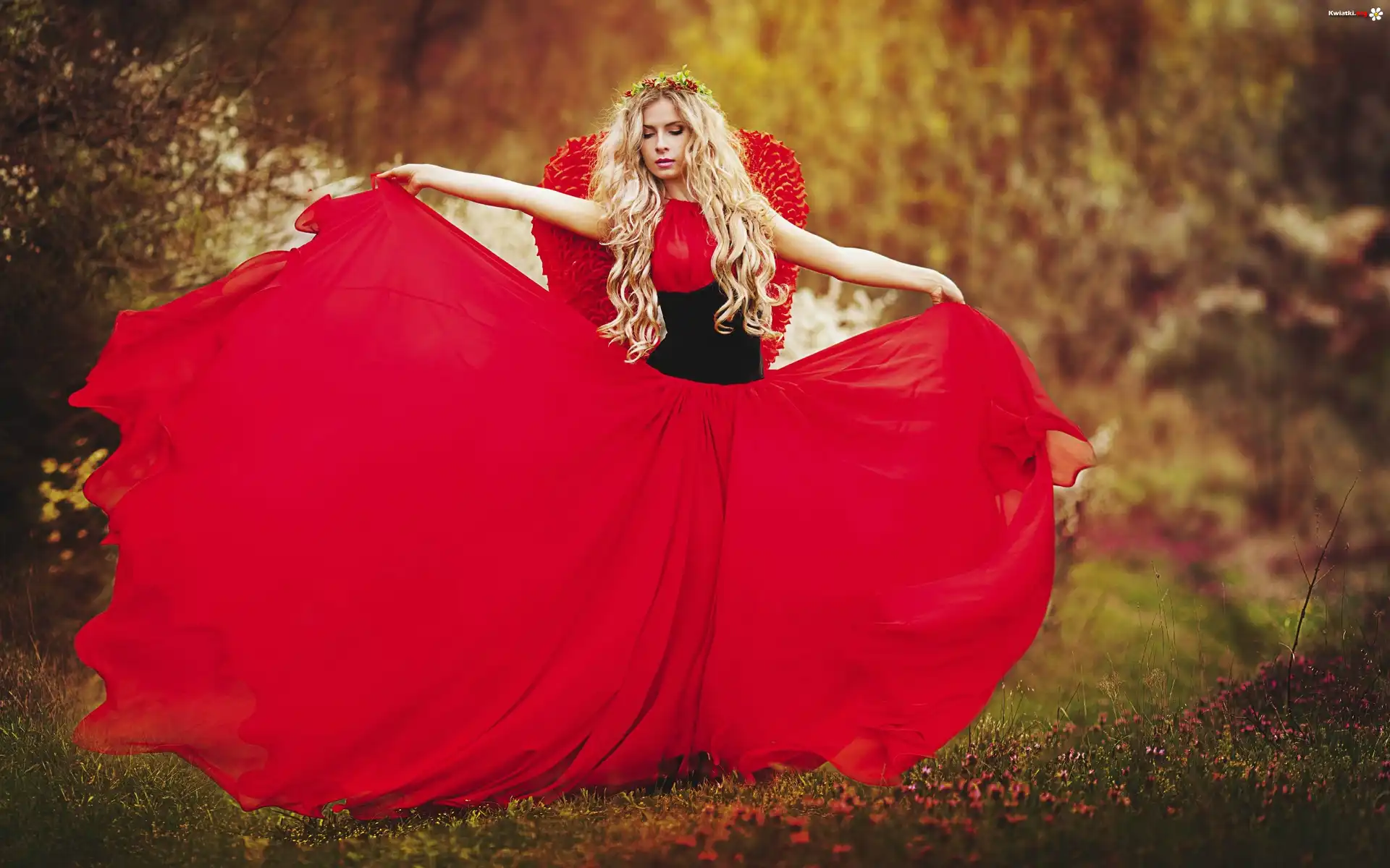 Blondynka, Wianuszek, Czerwona, Sukienka, Las, Kwiatuszki, Ścieżka - Zdjęcia