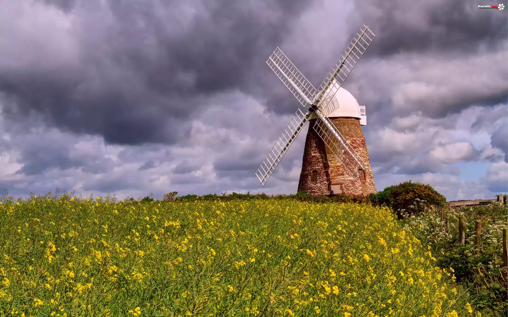 Wiatrak, Łąka, Mlecze, Ciemne, Chmury - Zdjęcia