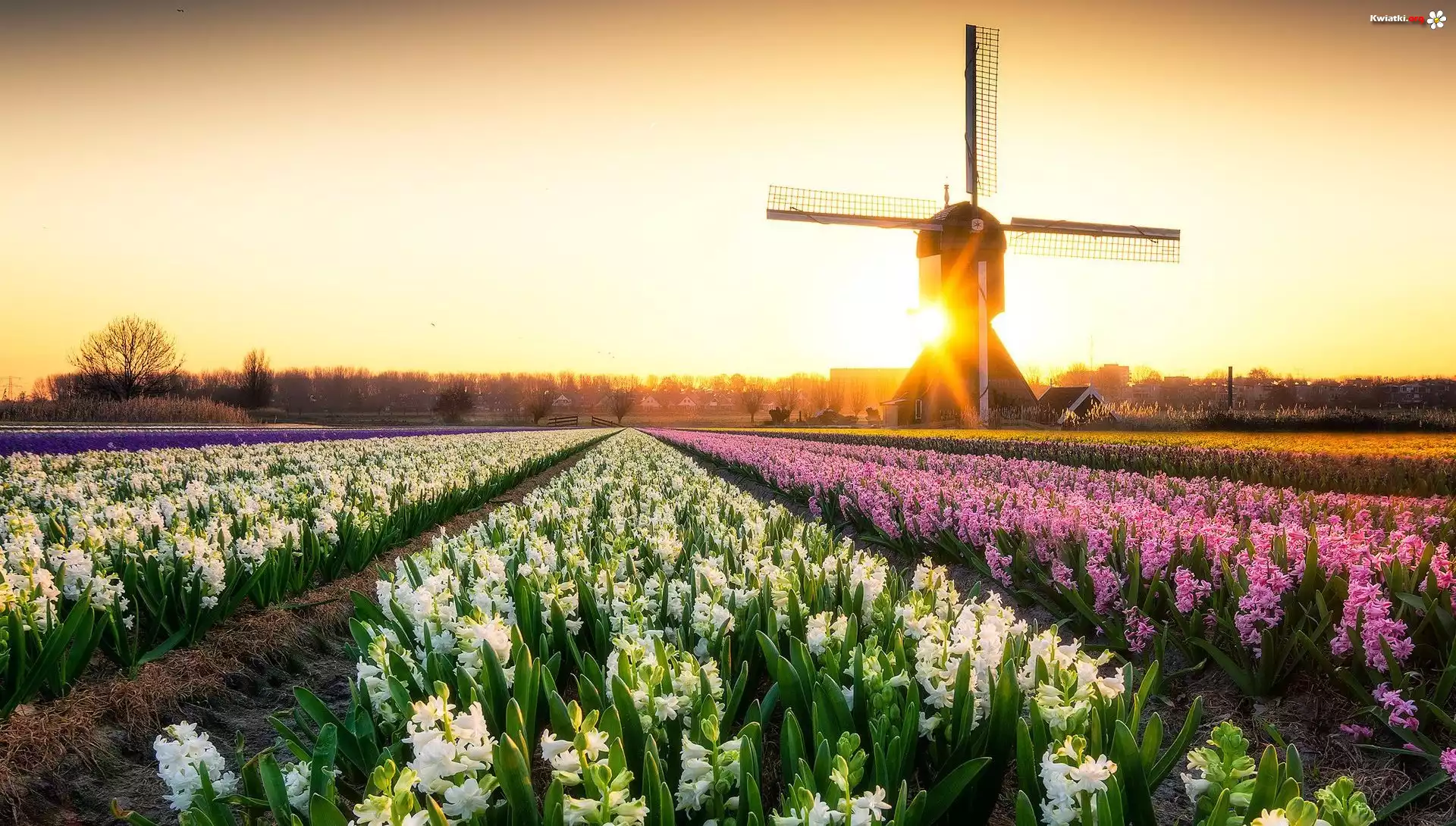 Wiatrak, Kwiaty, Hiacynty, Pole, Drzewa - Zdjęcia