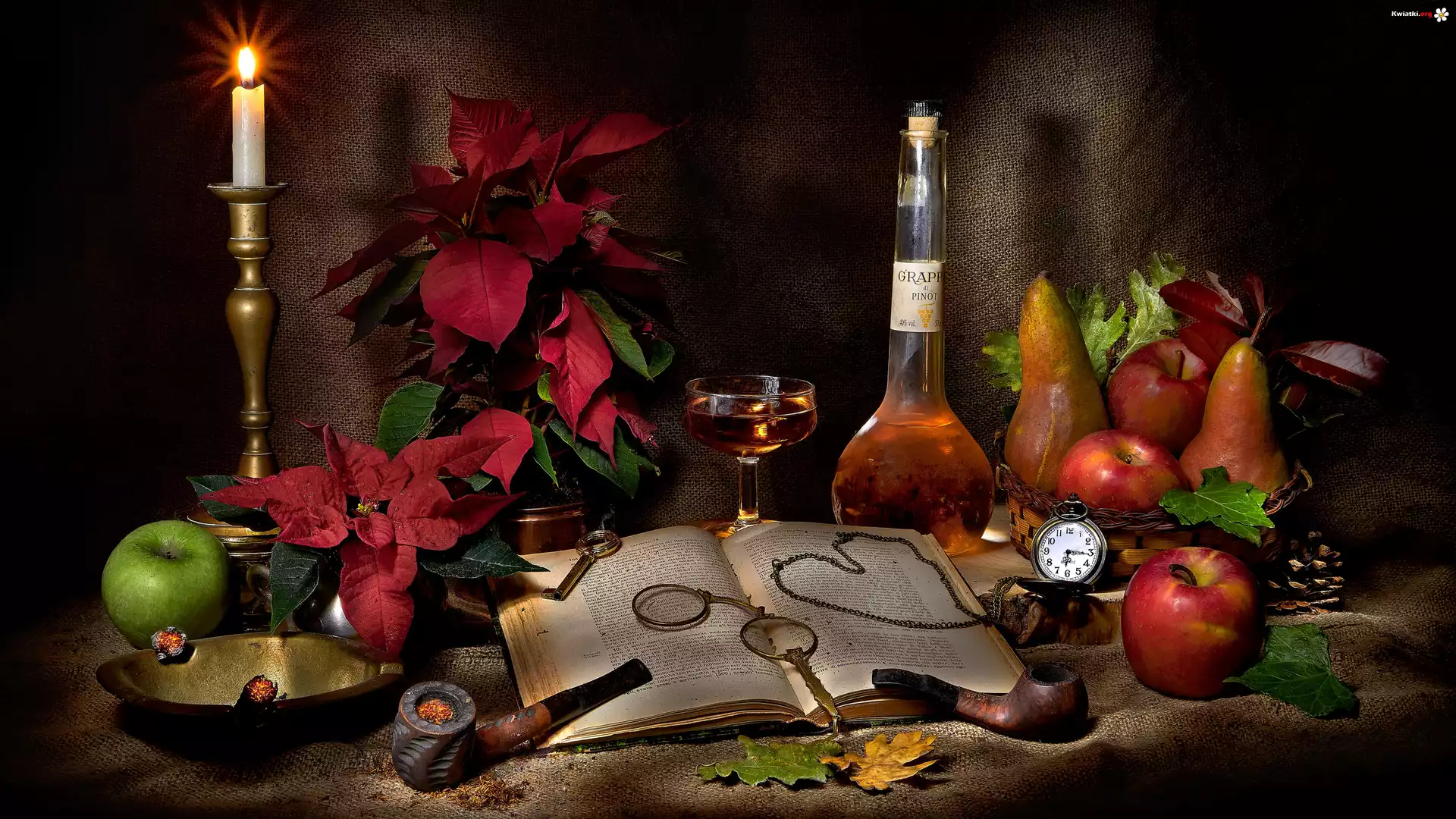 Gwiazda betlejemska, Świeca, Książka, Jabłka, Gruszki, Zegarek, Fajka, Butelka, Wino, Kompozycja - Zdjęcia |