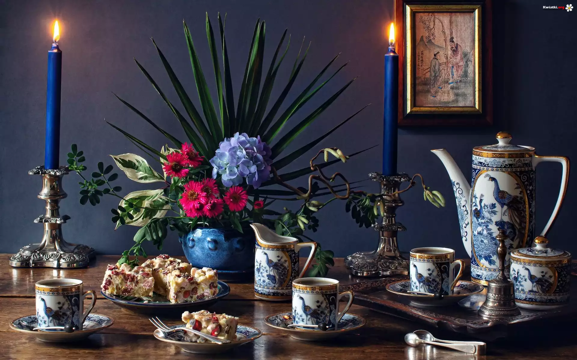 Kompozycja, Obraz, Świece, Bukiet, Kwiaty, Ciasto, Filiżanki, Dzbanek, Serwis kawowy, Dzwonek - Zdjęcia |