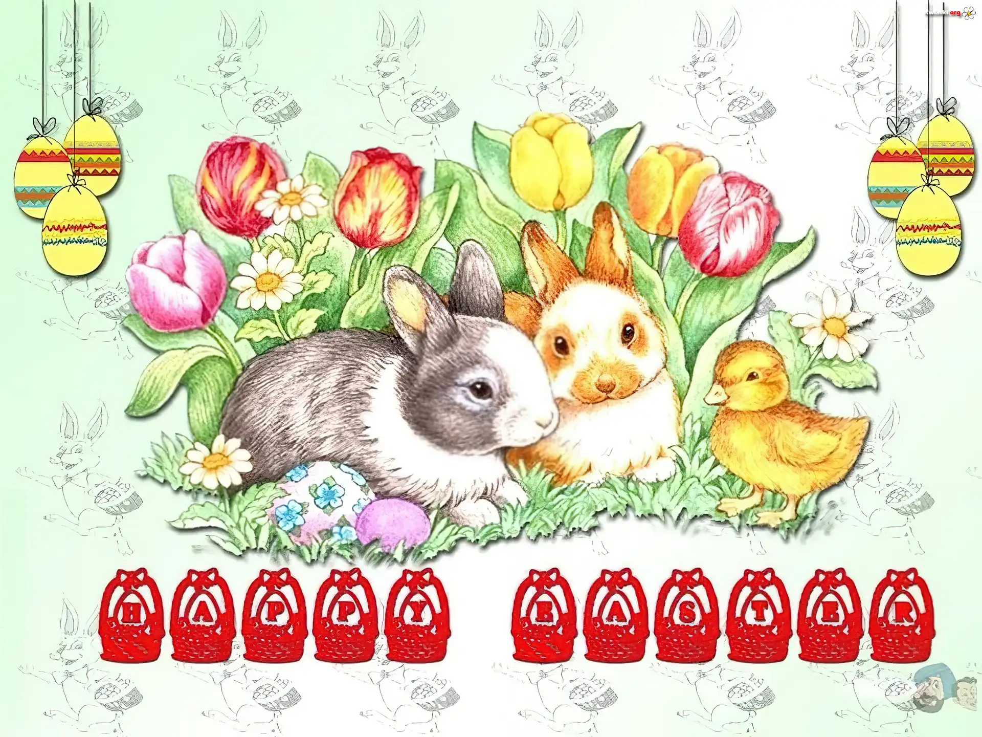 Wielkanoc,zajączki,kurczaczek,jajeczka, Tulipany - Zdjęcia