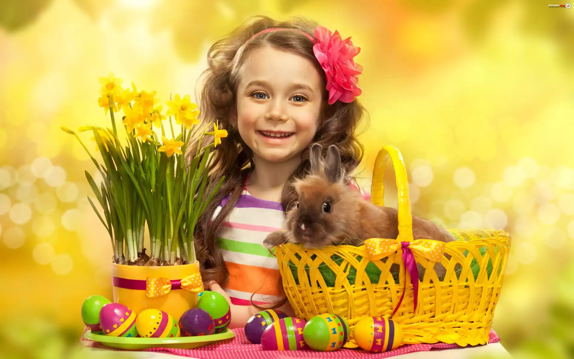 Kwiat Wielkanoc, Jajka, Dziewczynka, Koszyk, Królik, Żonkile