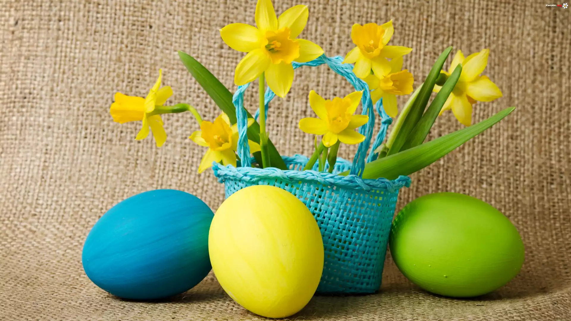 Kwiat Wielkanoc, Koszyczek, Narcyze, Żonkile, Pisanki, Kompozycja