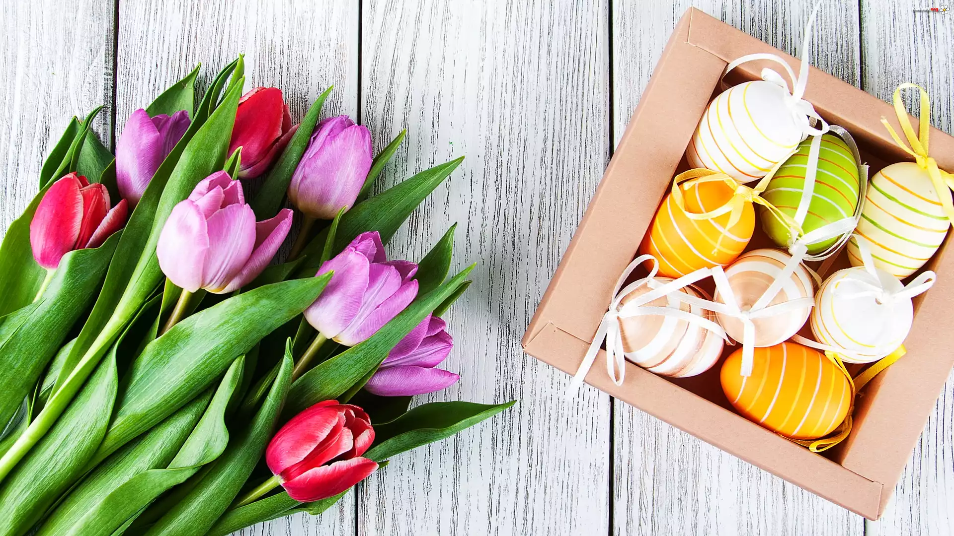 Wielkanoc, Pisanki, Pudełko, Tulipany, Deski - Zdjęcia