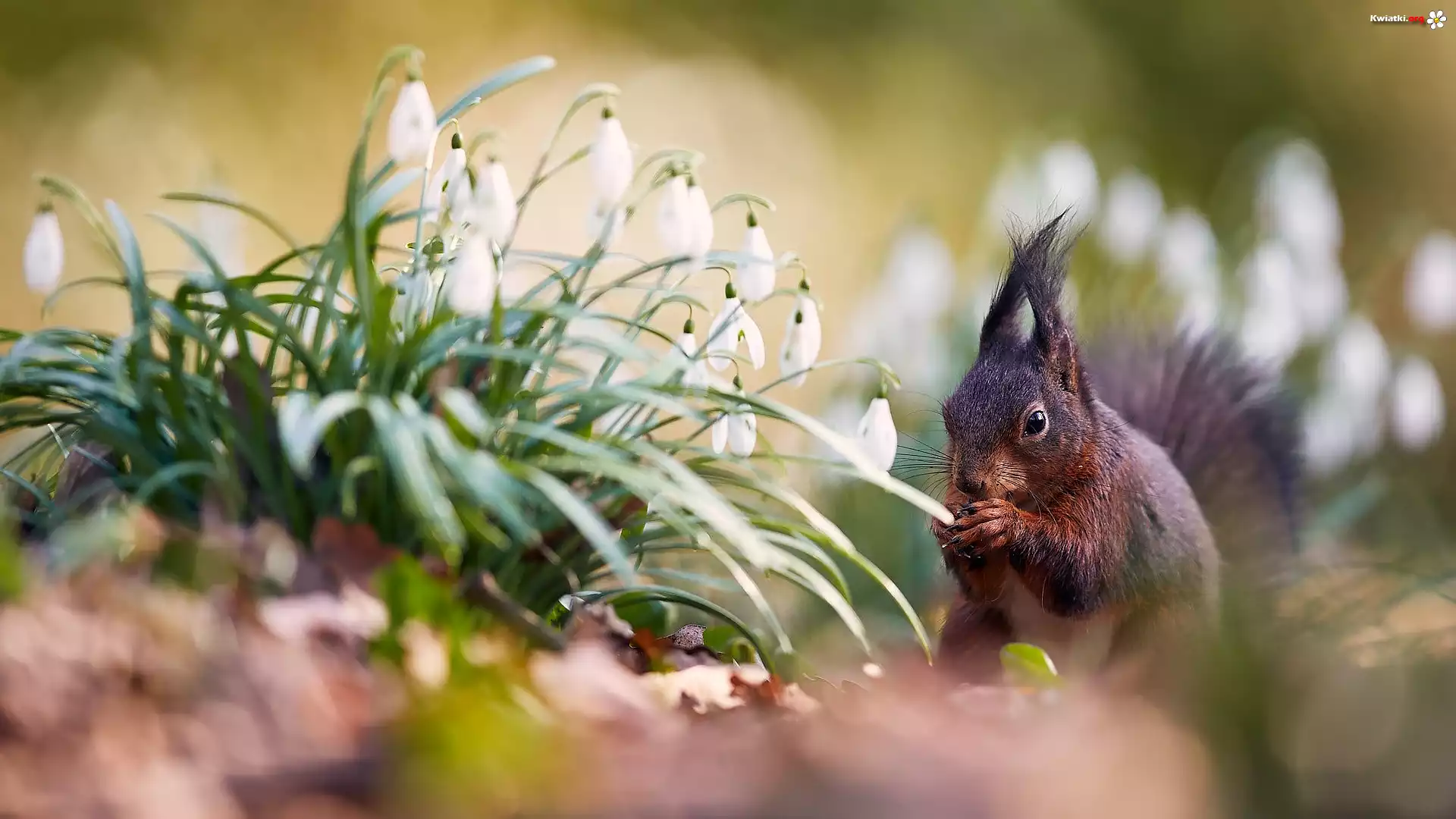 Wiewiórka, Kwiaty, Przebiśniegi - Zdjęcia