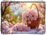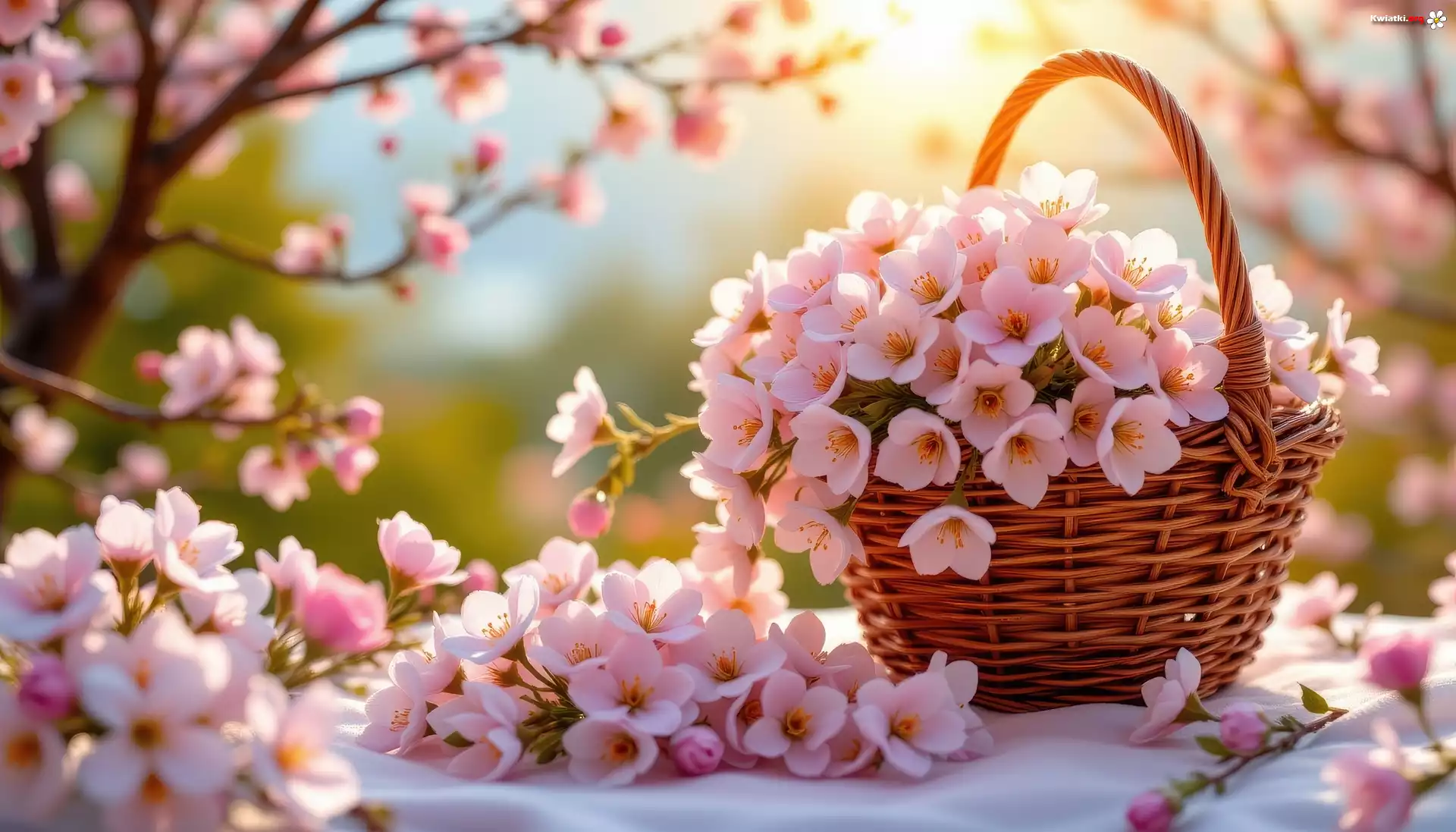 Różowe, Drobne, Kwiaty, Wiklinowy, Koszyk, Gałązki - Zdjęcia