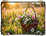 Różowe, Białe, Kwiaty, Wiklinowy, Koszyk, Trawa - Zdjęcia