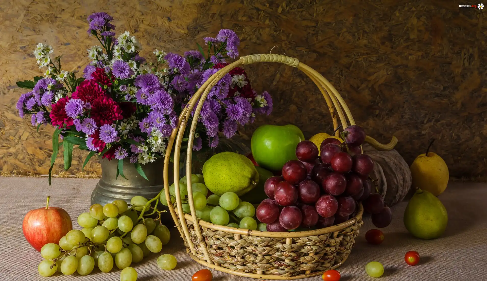 Wazon, Bukiet, Kwiaty, Astry marcinki, Koszyk, Owoce, Jabłka, Gruszki, Winogrona - Zdjęcia