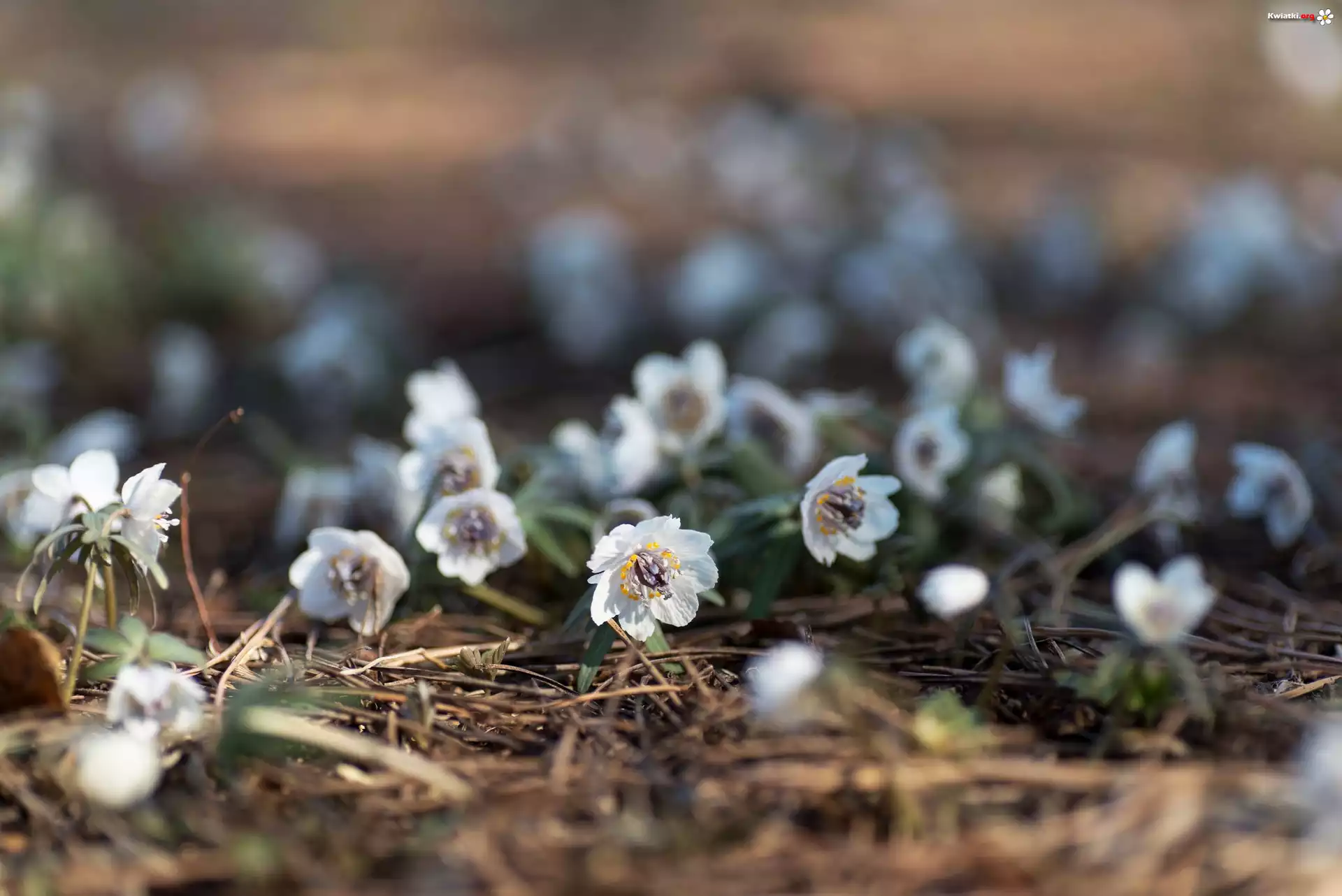 Wiosenne, Kwiatki, Eranthis pinnatifida, Ranniki, Ściółka - Zdjęcia