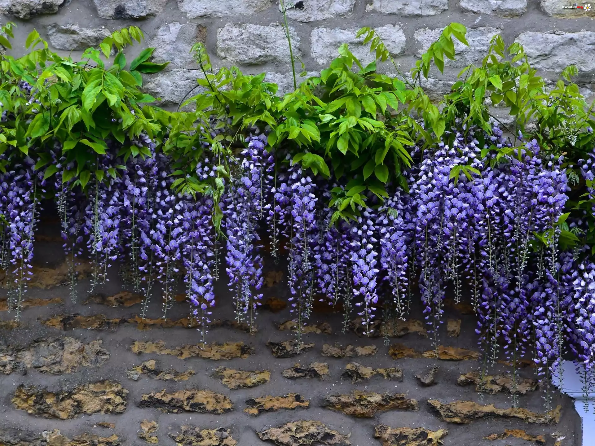 Wisteria, Kwiaty, Liście, Mur - Zdjęcia