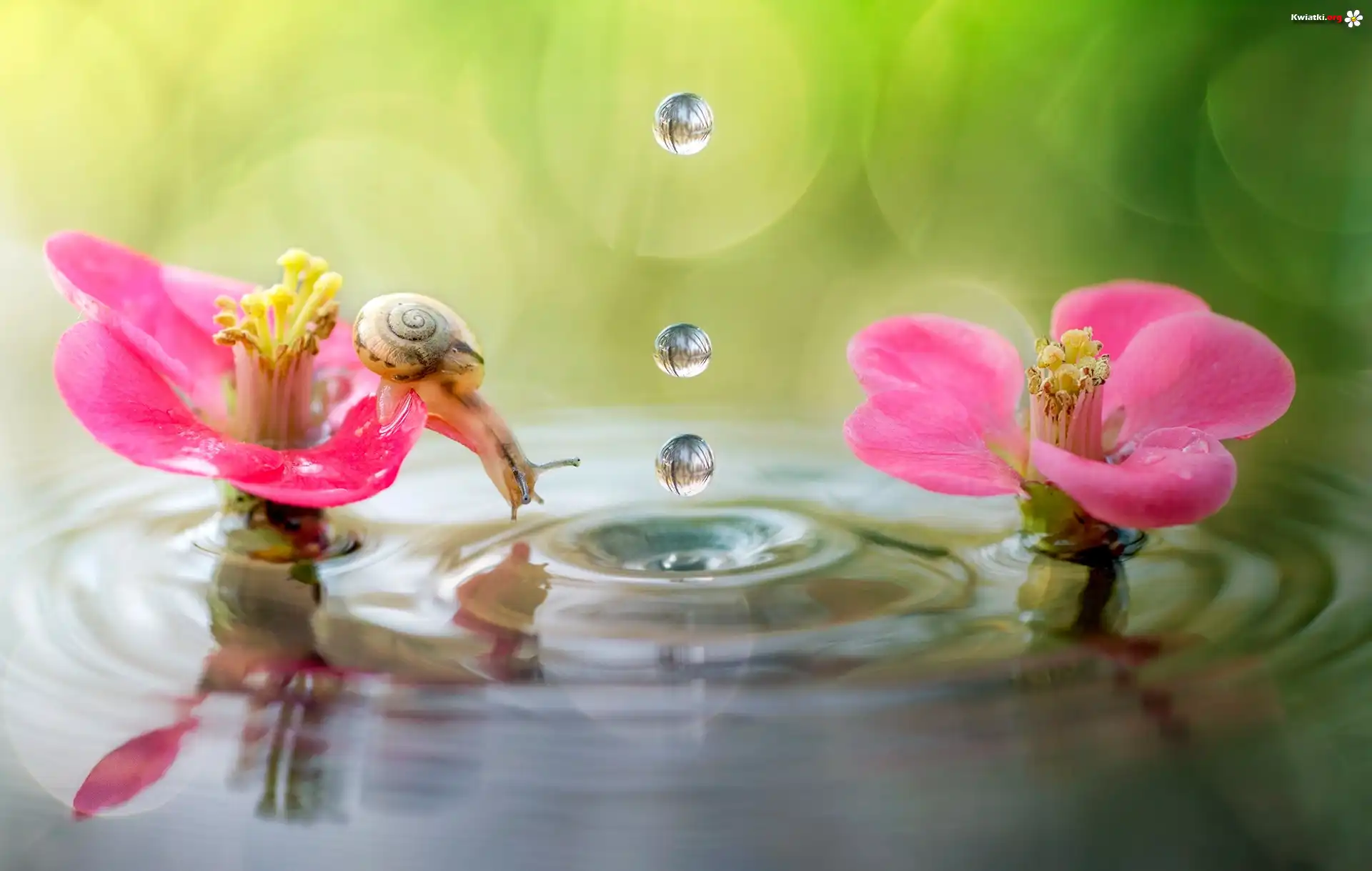 Woda, Kwiaty, Ślimak, Krople, Woda - Zdjęcia