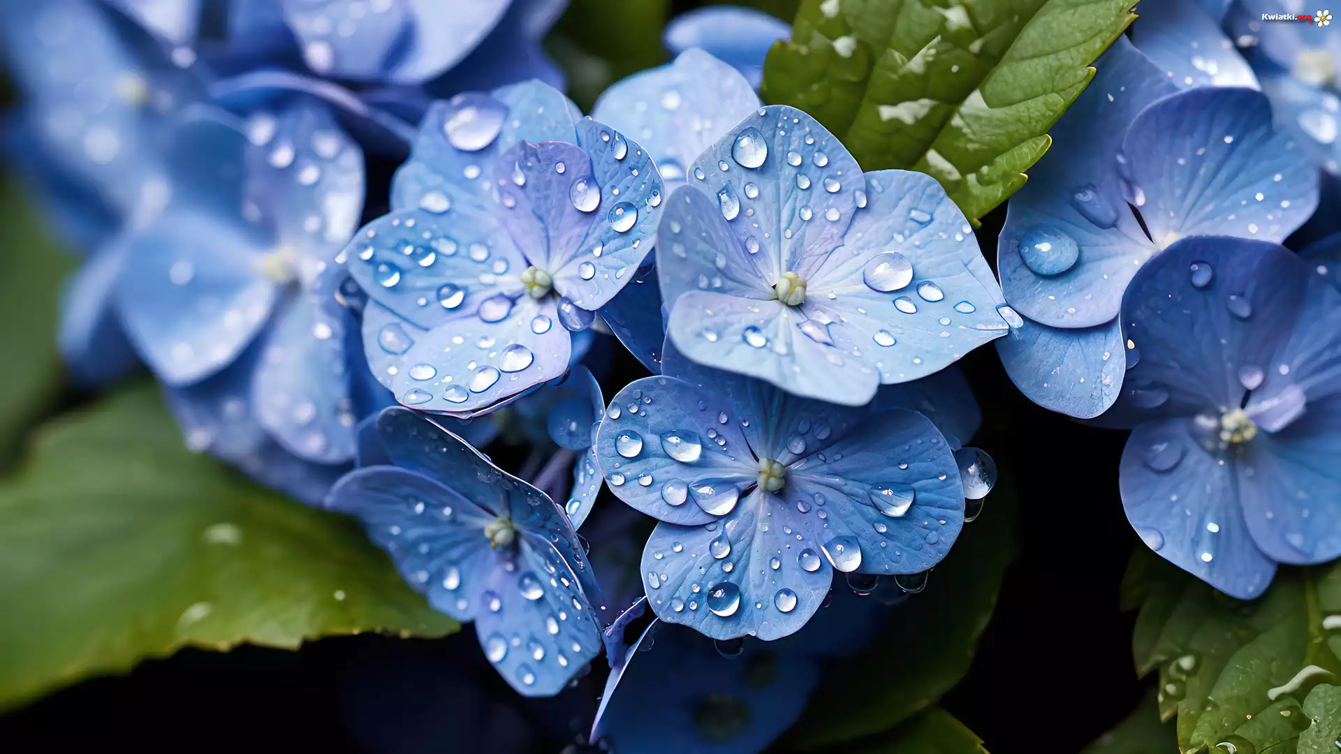 Niebieskie, Hortensje, Krople, Woda - Zdjęcia