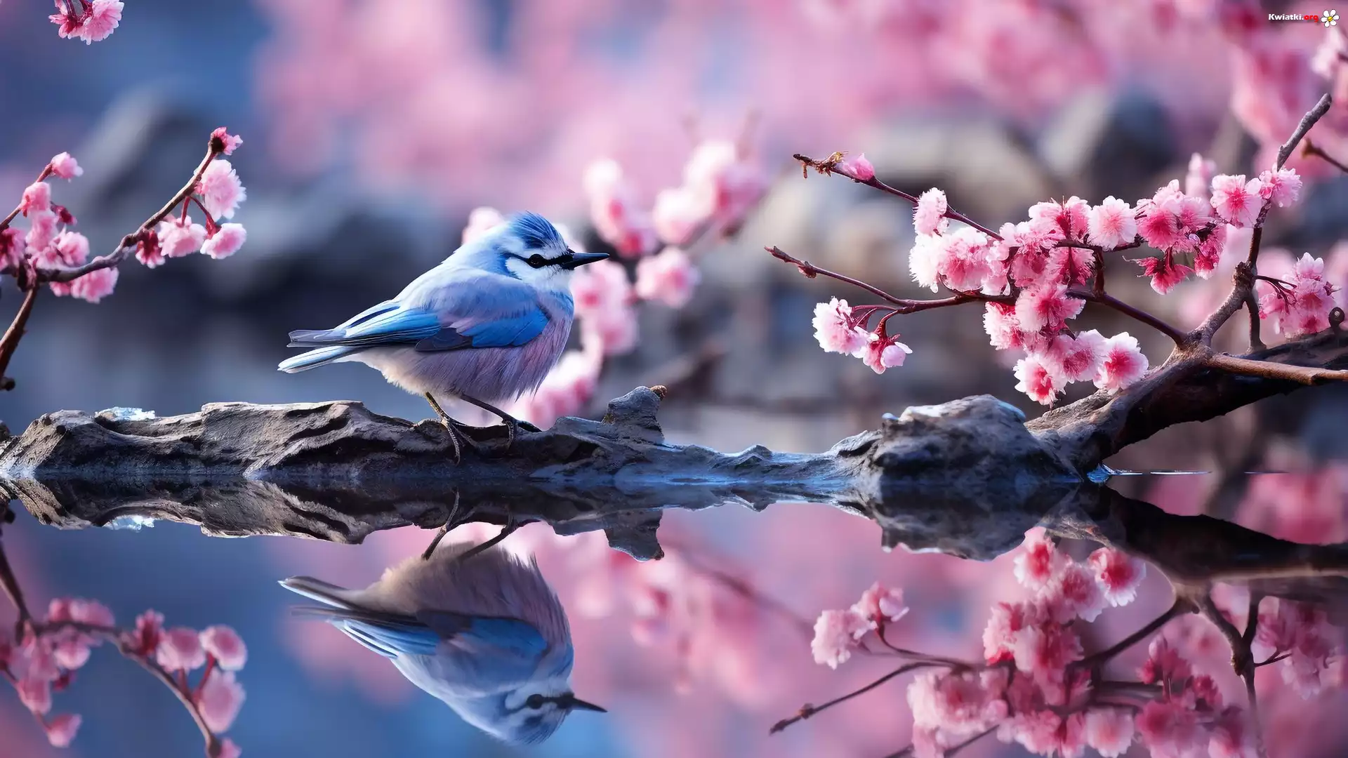 Kwiat Ptak, Woda, Odbicie, Różowe, Kwiaty