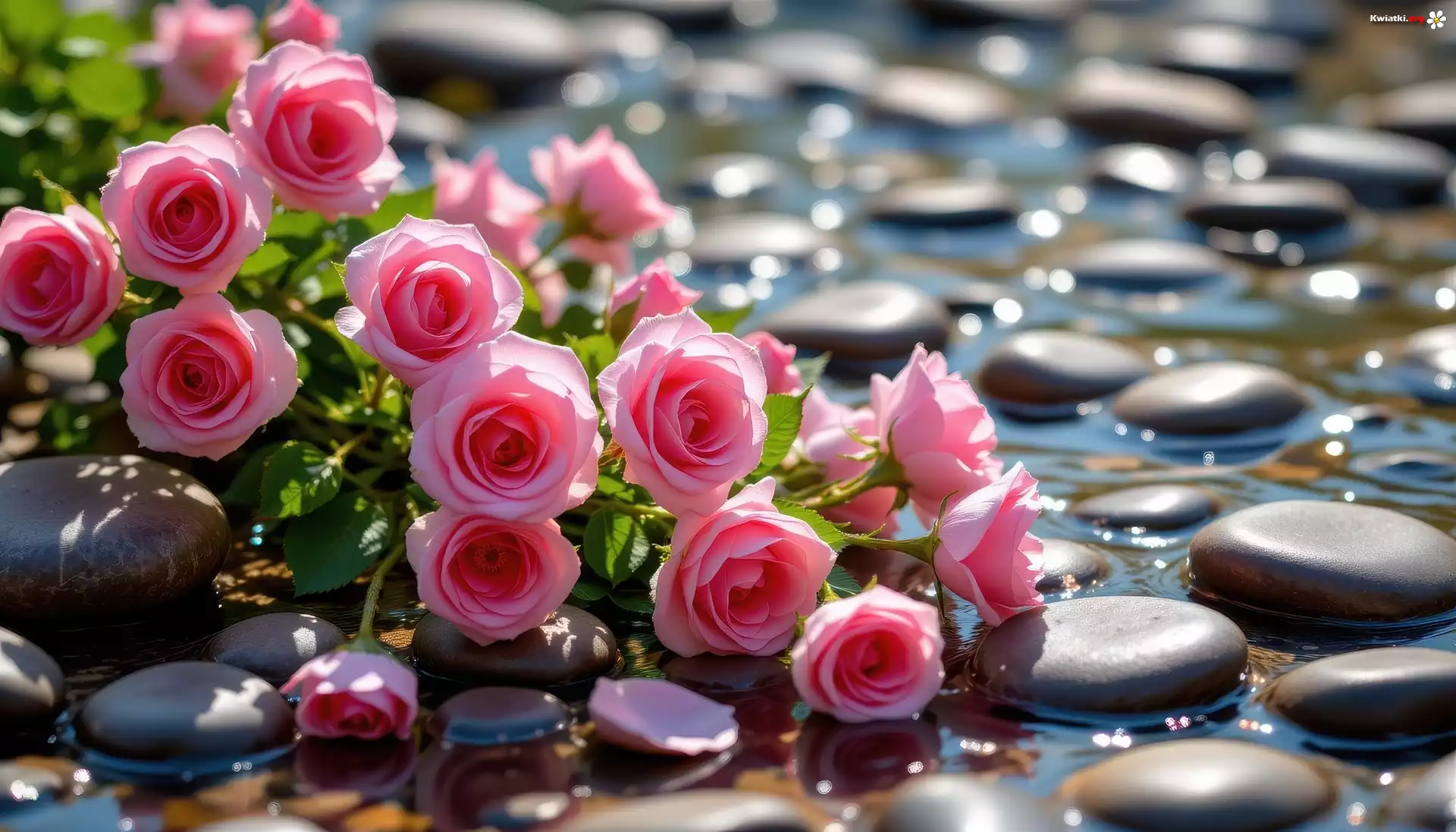 Kwiat Różowe, Róże, Kamienie, Woda