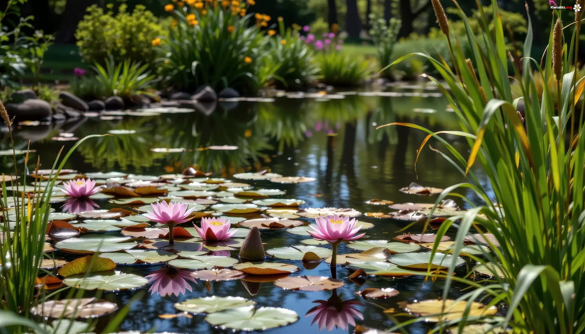 Staw, Trzciny, Lilia wodna, Kwiaty, Grafika - Zdjęcia