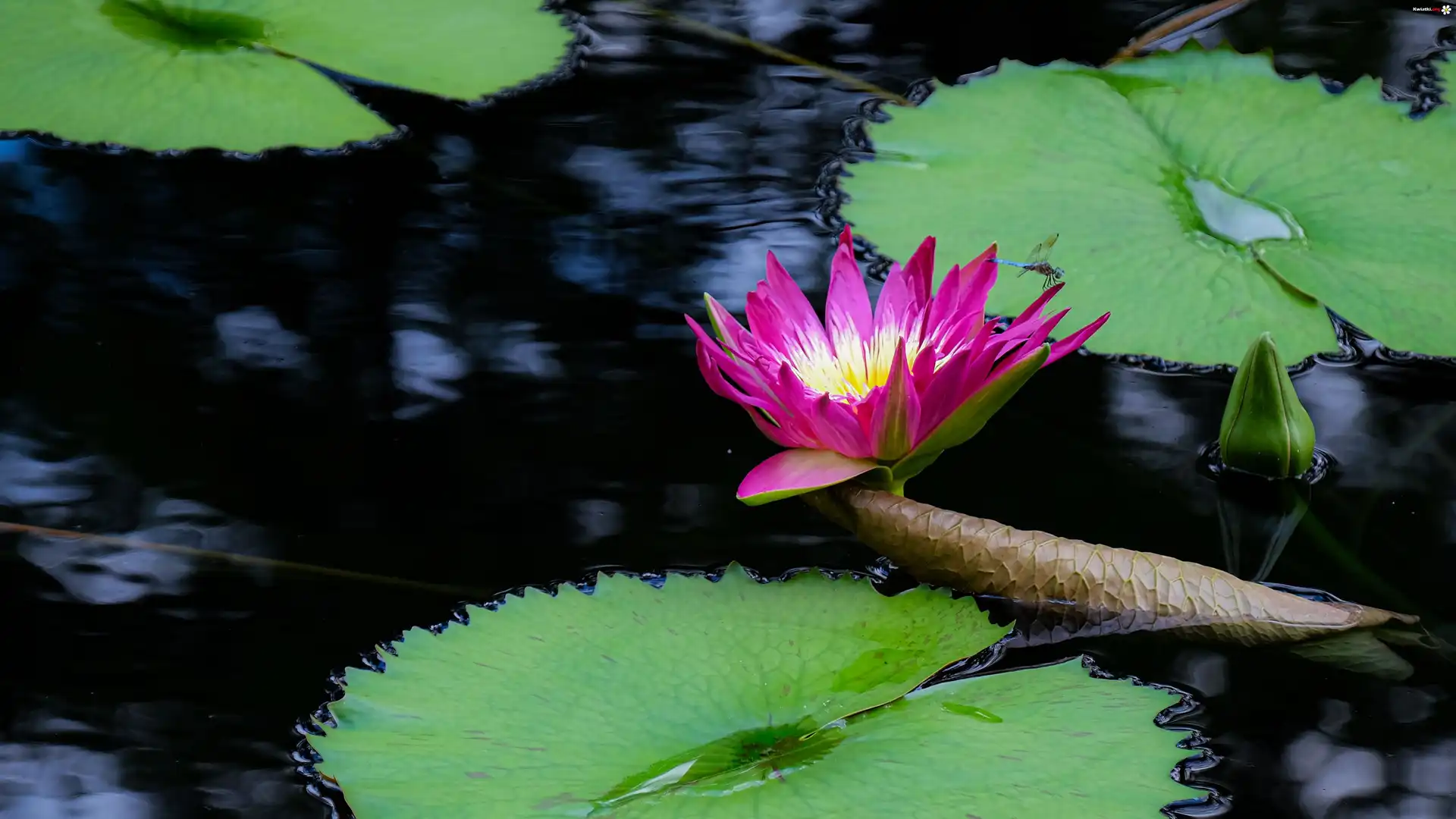 Kwiat Lilia wodna, Ważka, Liście, Woda