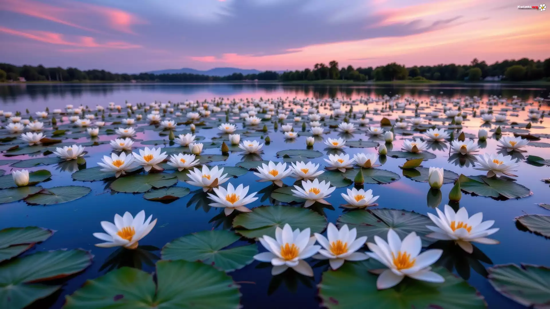 Jezioro, Białe, Lilie wodne, Niebo, Drzewa, Góry - Zdjęcia