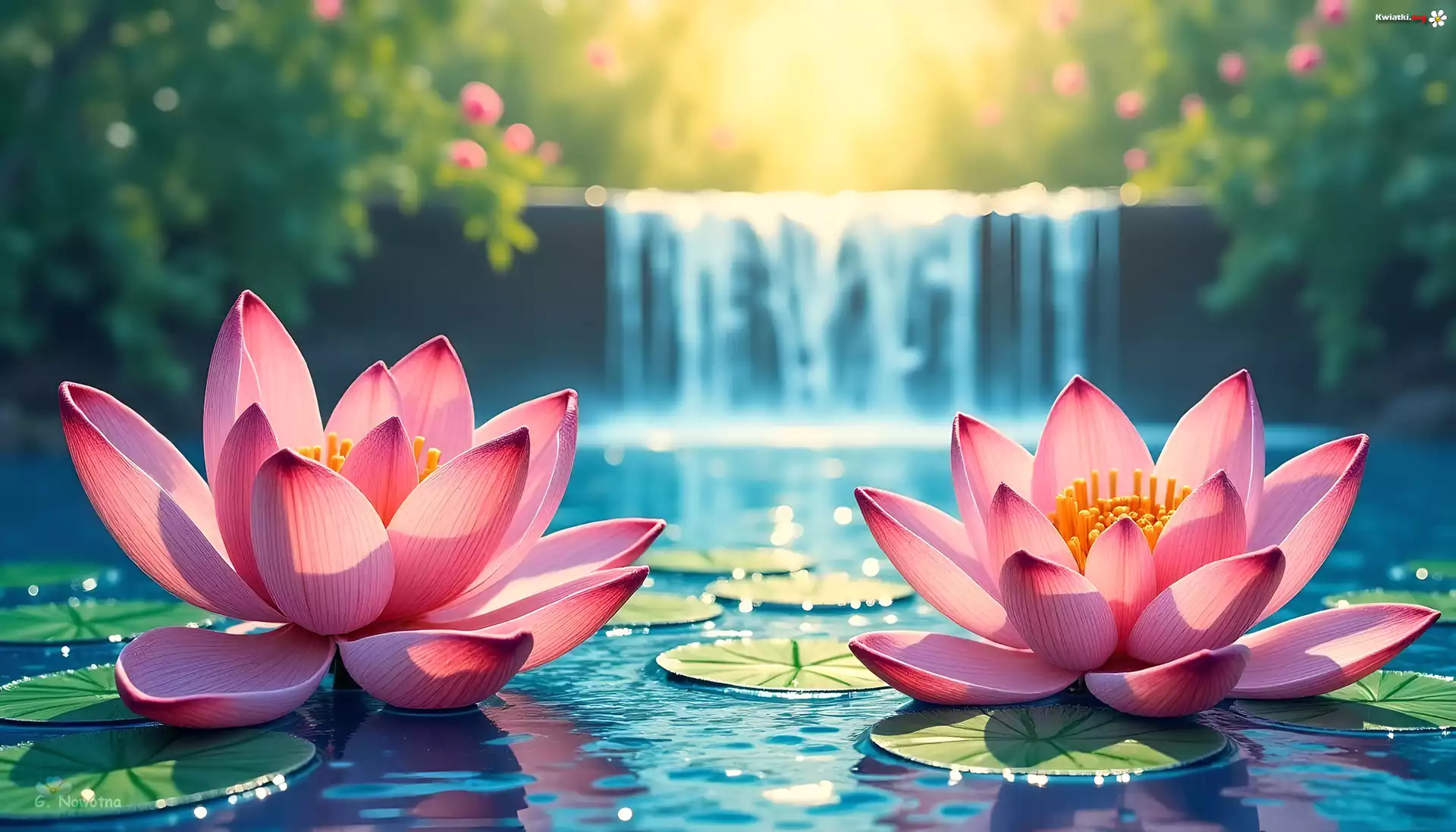 Kwiat Różowe, Dwie, Lilie wodne, Kwiaty, Wodospad, Grafika
