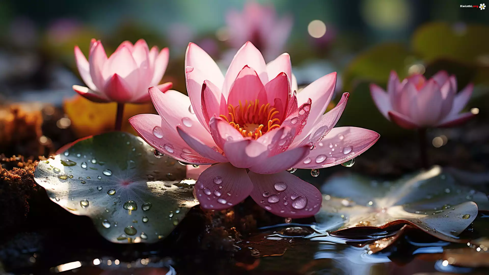 Kwiat Kwiaty, Różowe, Lilie wodne, Liście, Krople, Staw