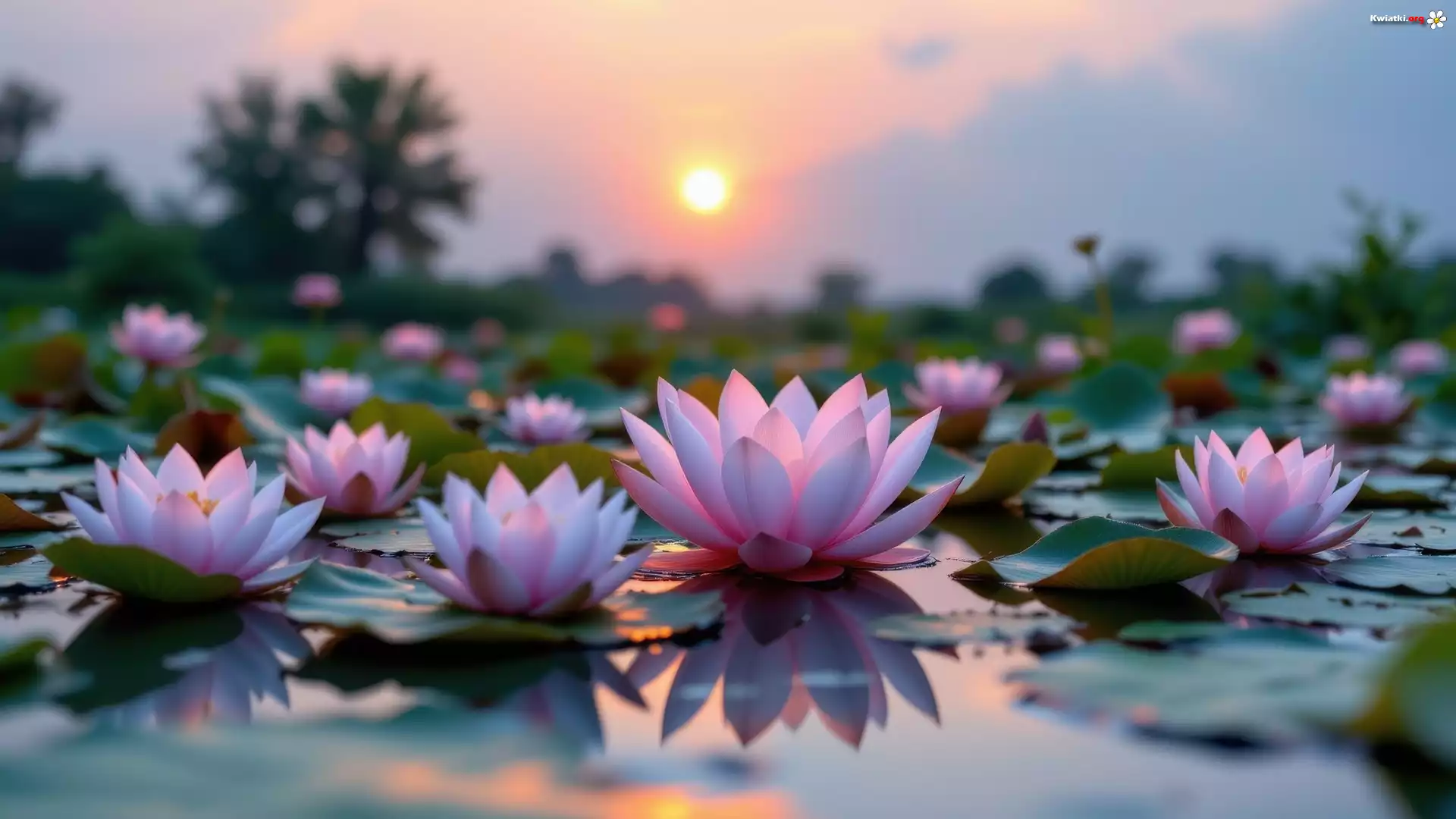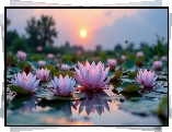 Kwiat Kwiaty, Różowe, Lilie wodne, Woda, Słońce