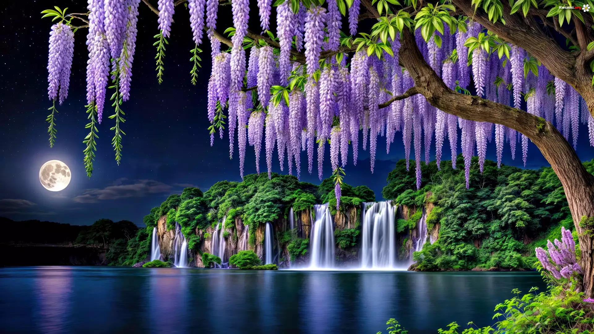 Glicynia, Kwiaty, Jezioro, Wodospady, Noc, Grafika - Zdjęcia