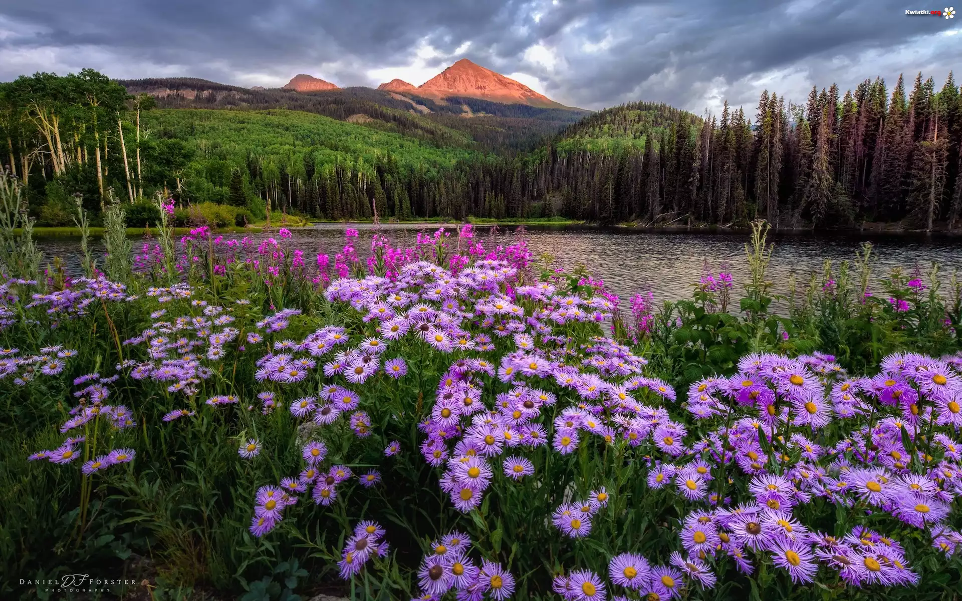 Stany Zjednoczone, Kolorado, Telluride, Góry, Jezioro, Woods Lake, Kwiaty, Astry, Drzewa - Zdjęcia
