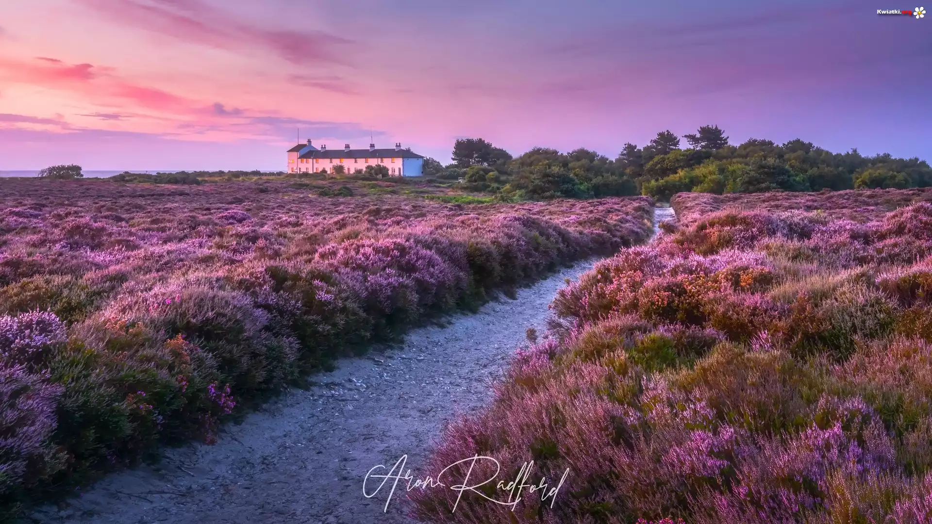 Wrzosowisko, Kwiaty, Wrzosy, Drzewa, Droga, Domy, Dunwich, Hrabstwo Suffolk, Anglia - Zdjęcia