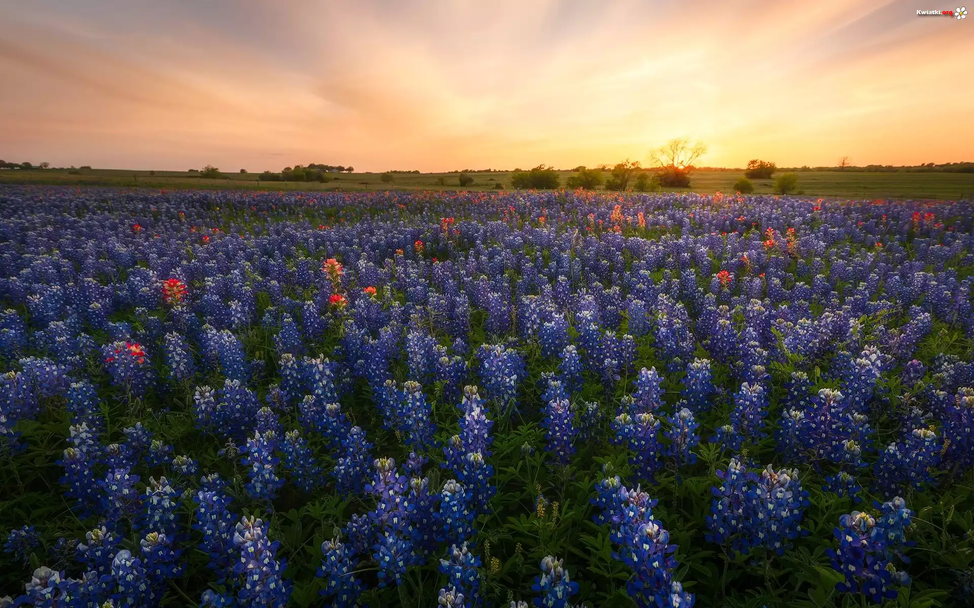 Łubin, Łąka, Drzewa, Wschód słońca - Zdjęcia