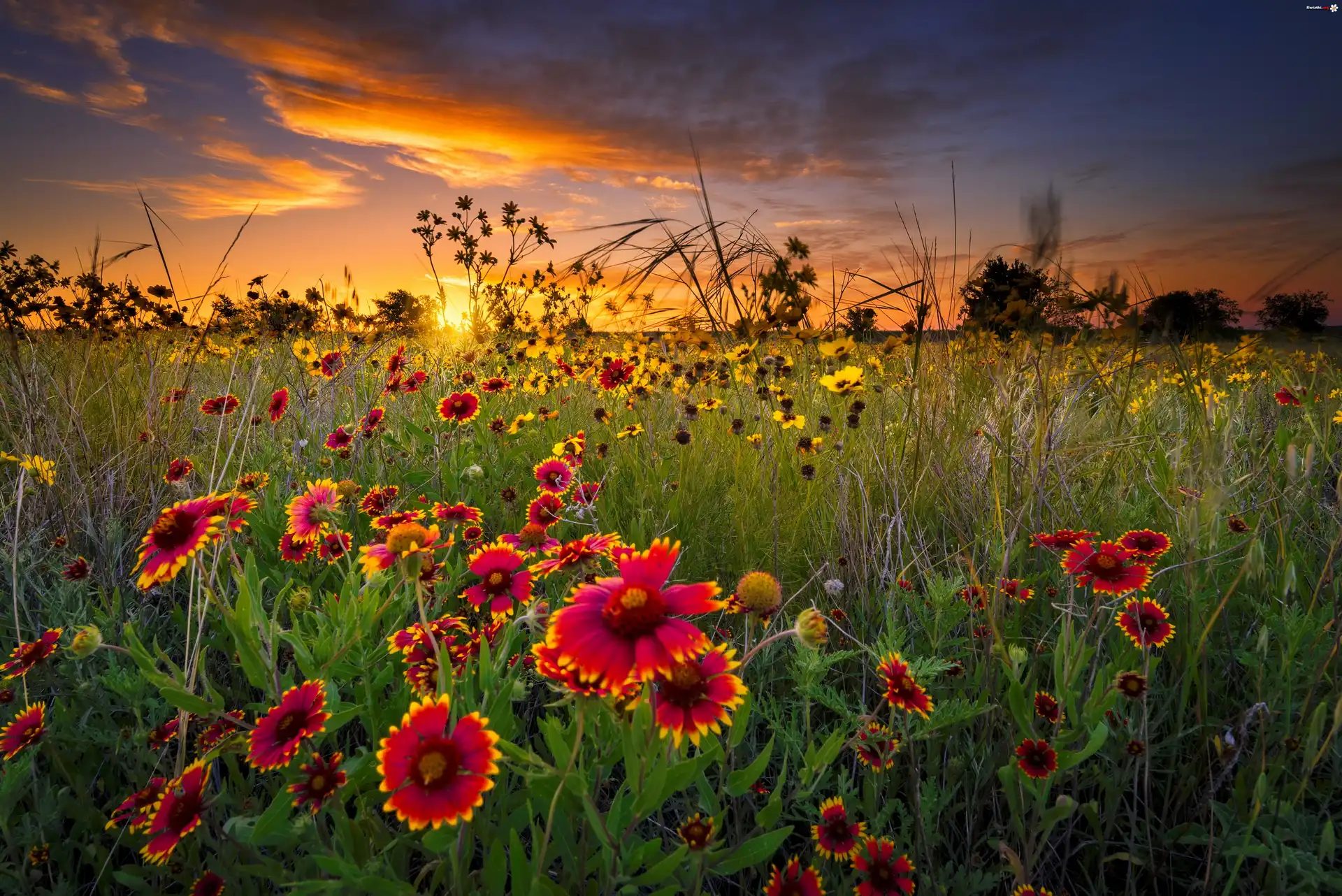 Wschód słońca, Łąka, Polne kwiaty, Gailardia - Zdjęcia