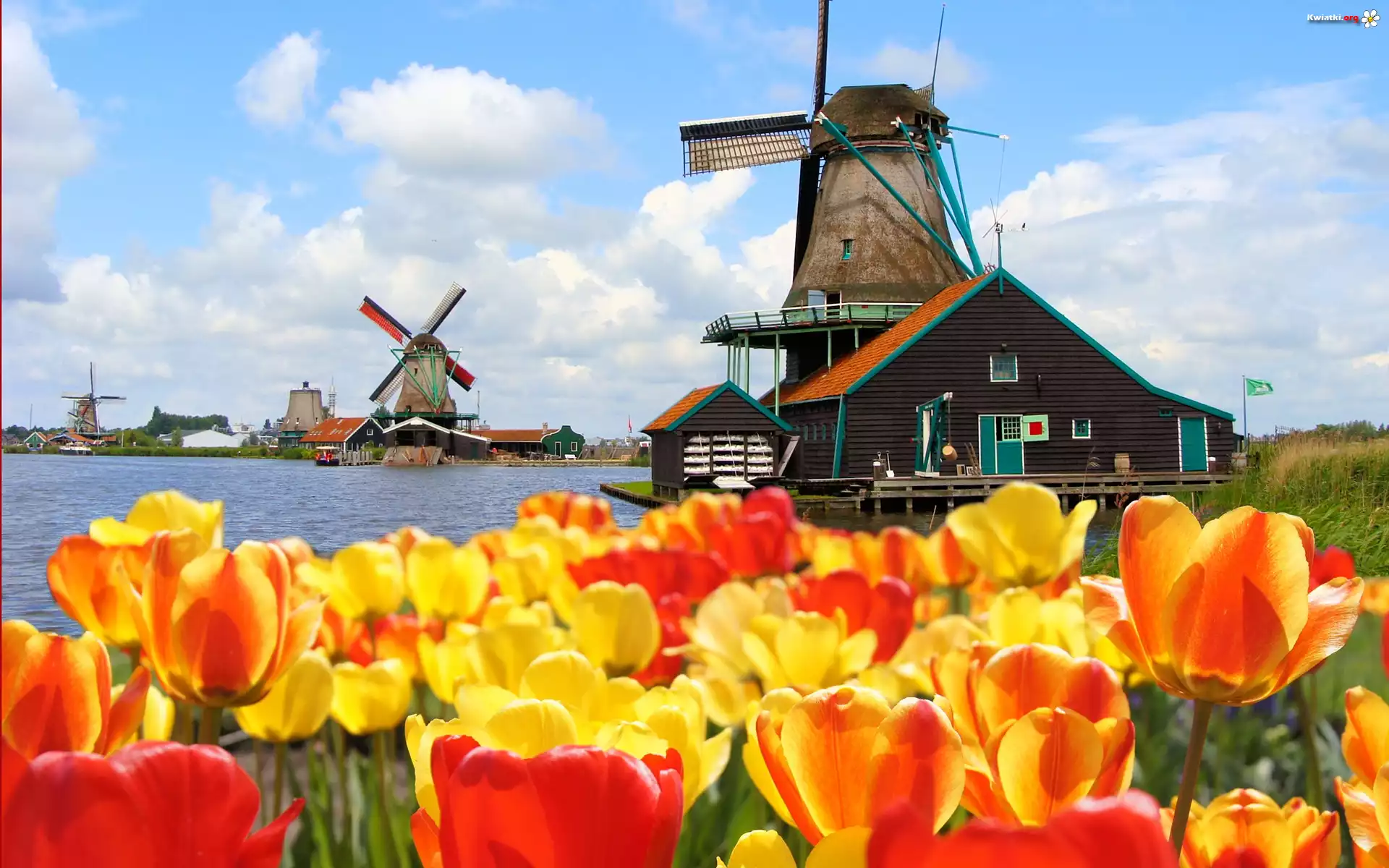 Kwiat Wybrzeże, Domy, Wiatraki, Tulipany, Wiosna