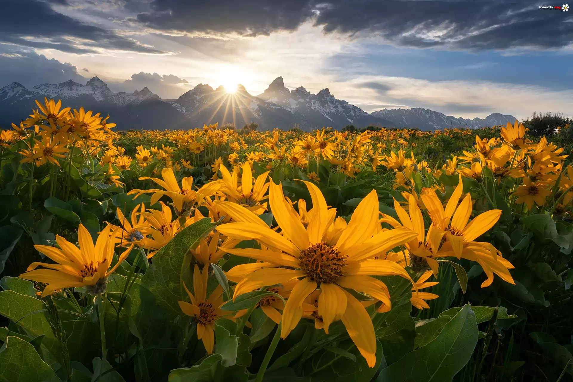 Stany Zjednoczone, Stan Wyoming, Park Narodowy Grand Teton, Góry, Łąka, Kwiaty, Balsamorhiza, Chmury - Zdjęcia |