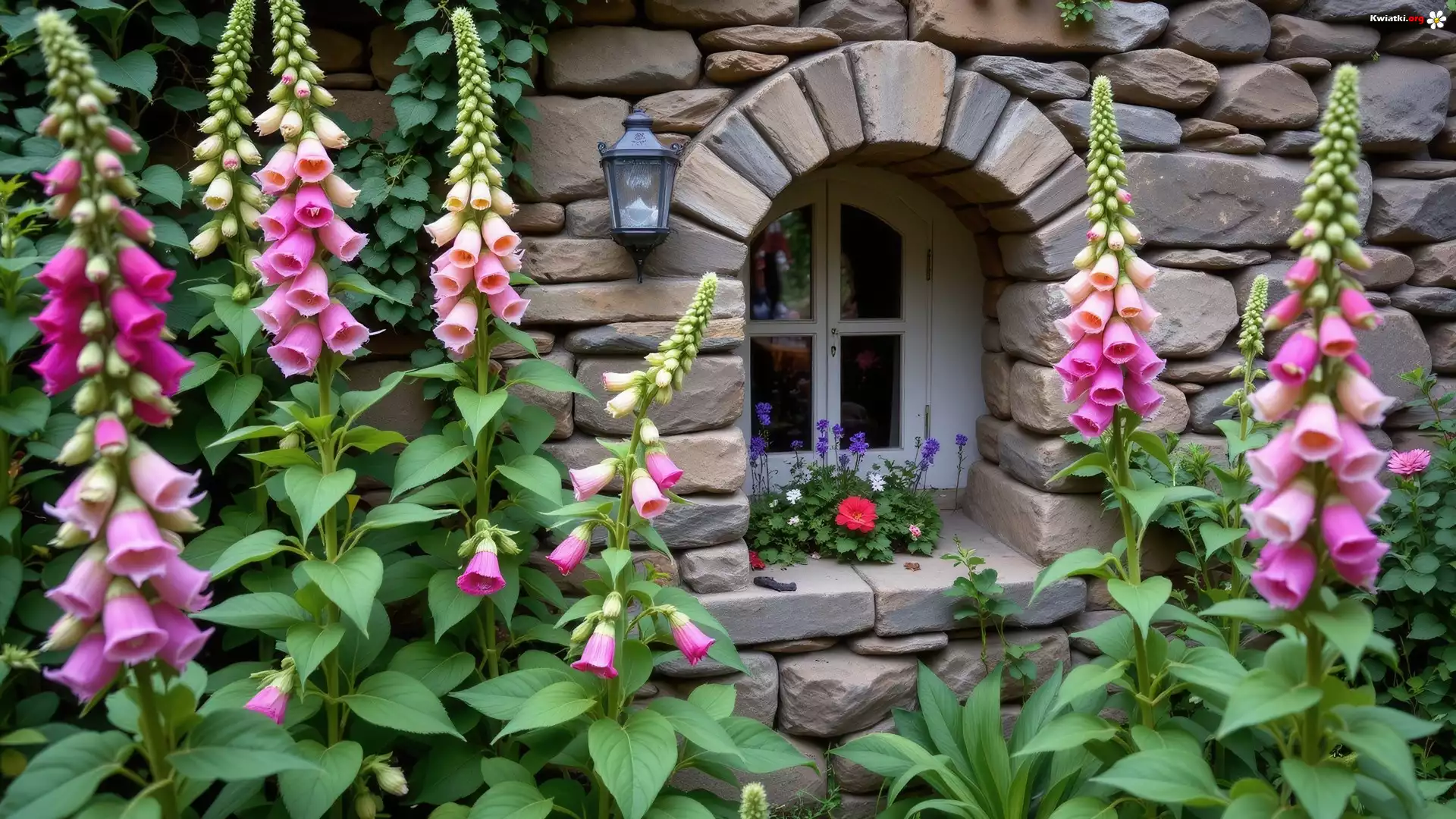 Kamienna, Ściana, Okno, Wysokie, Kwiaty, Różowe, Naparstnice - Zdjęcia