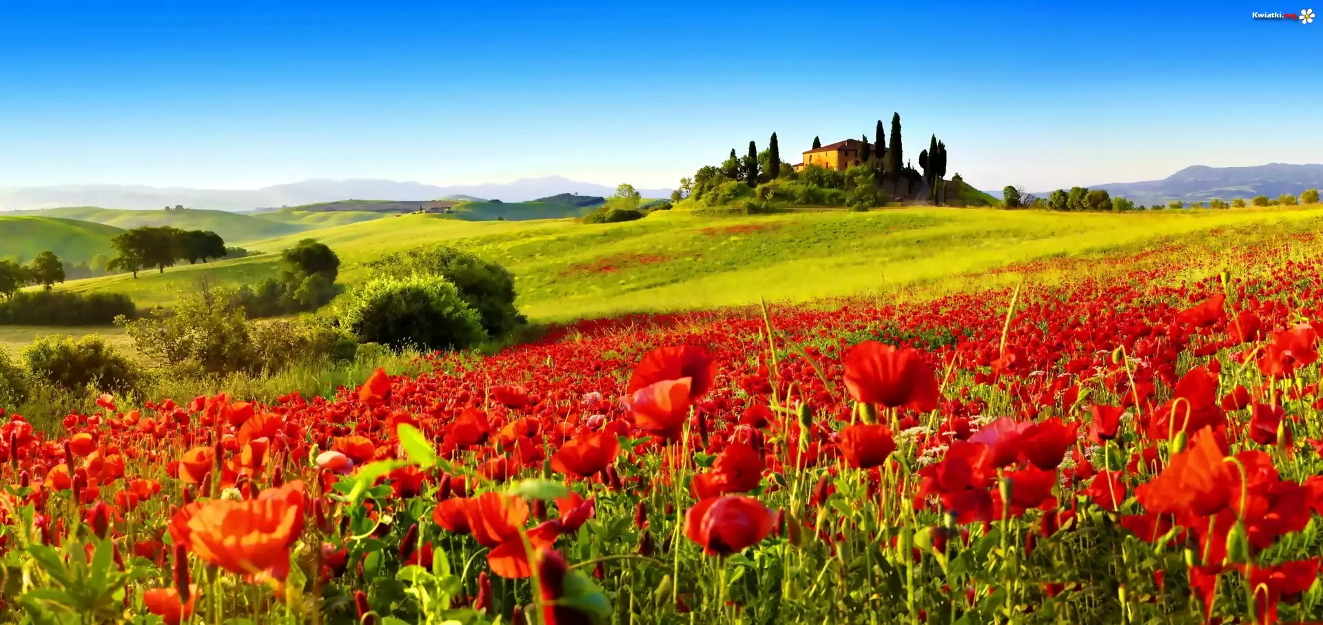 Kwiat Wzgórza, Dom, Łąki, Maki, Toskania, Włochy