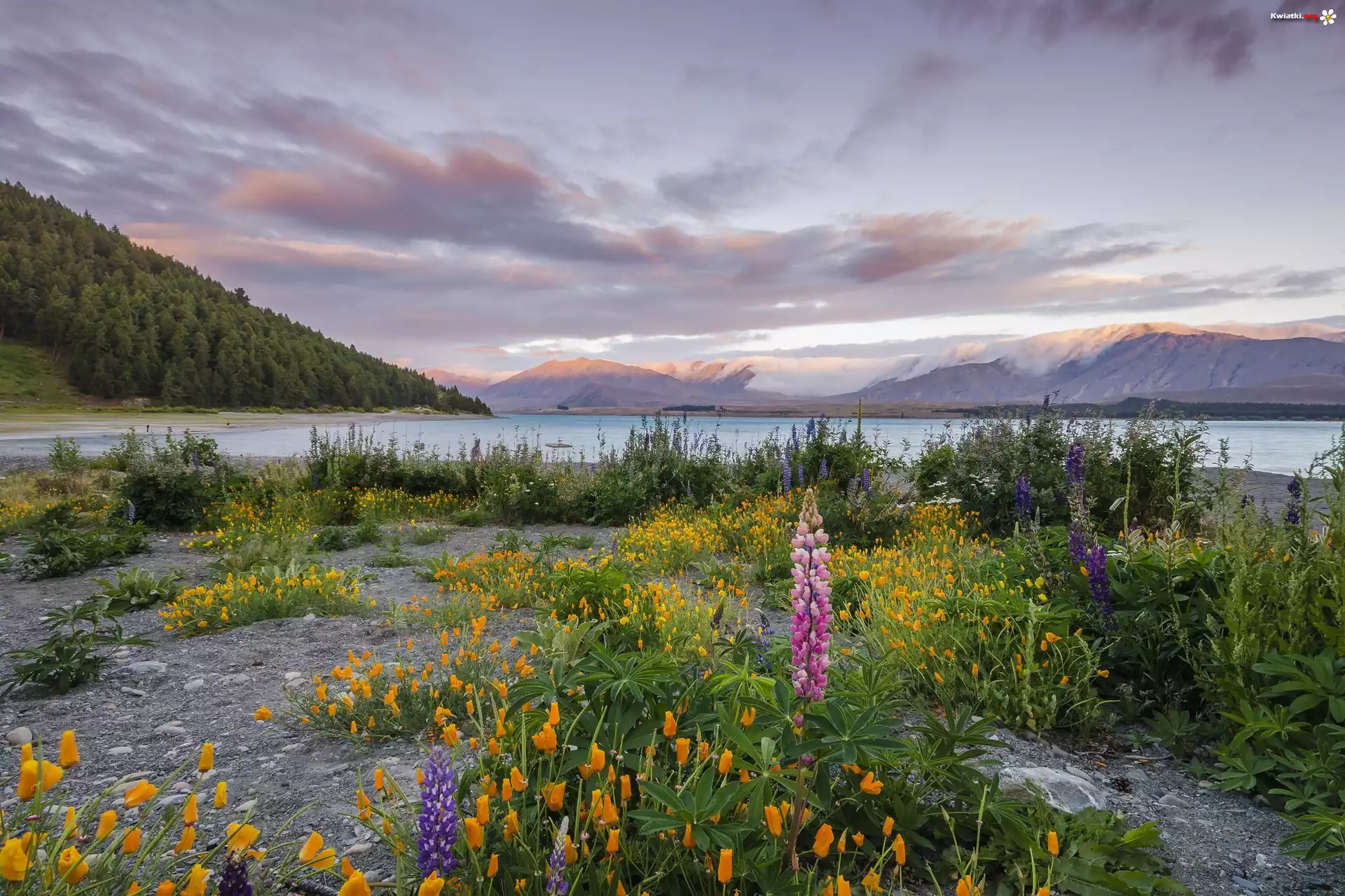 Nowa Zelandia, Jezioro Tekapo, Chmury, Góry, Kwiaty, Łubin, Roślinność, Wzgórza - Zdjęcia
